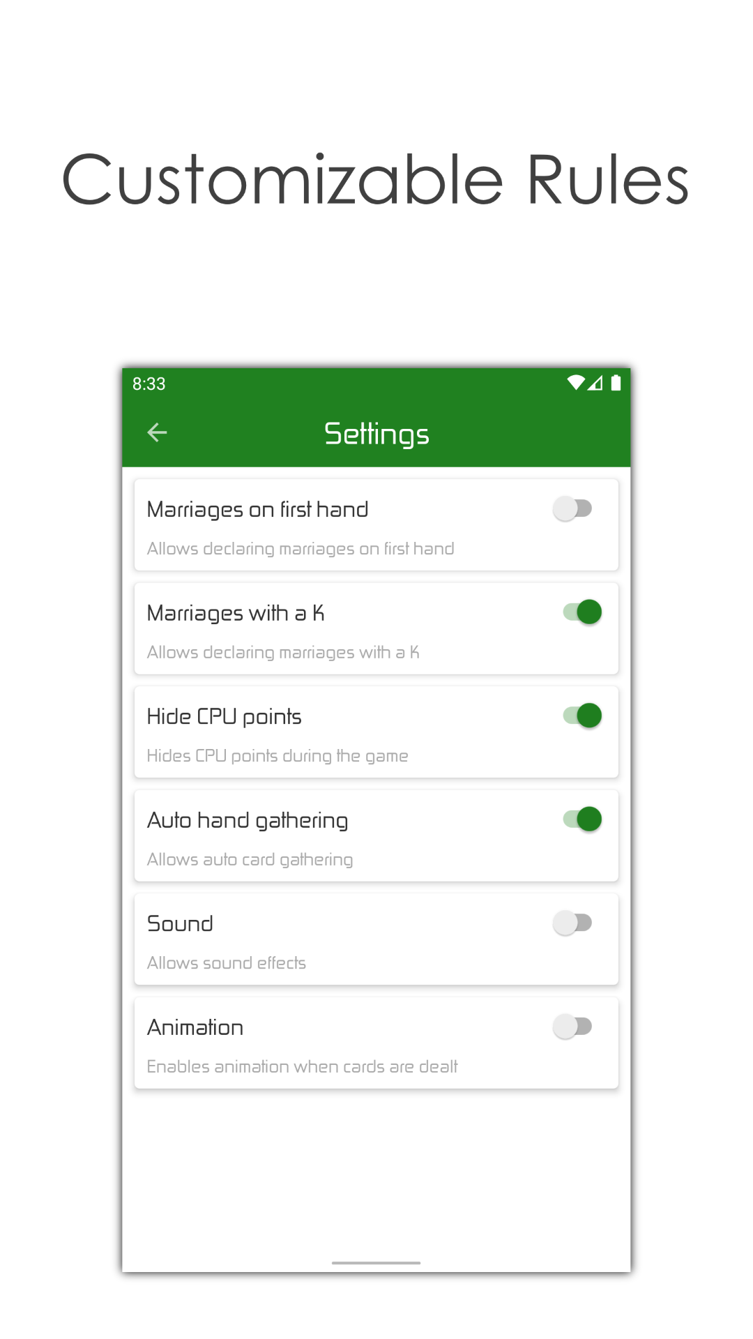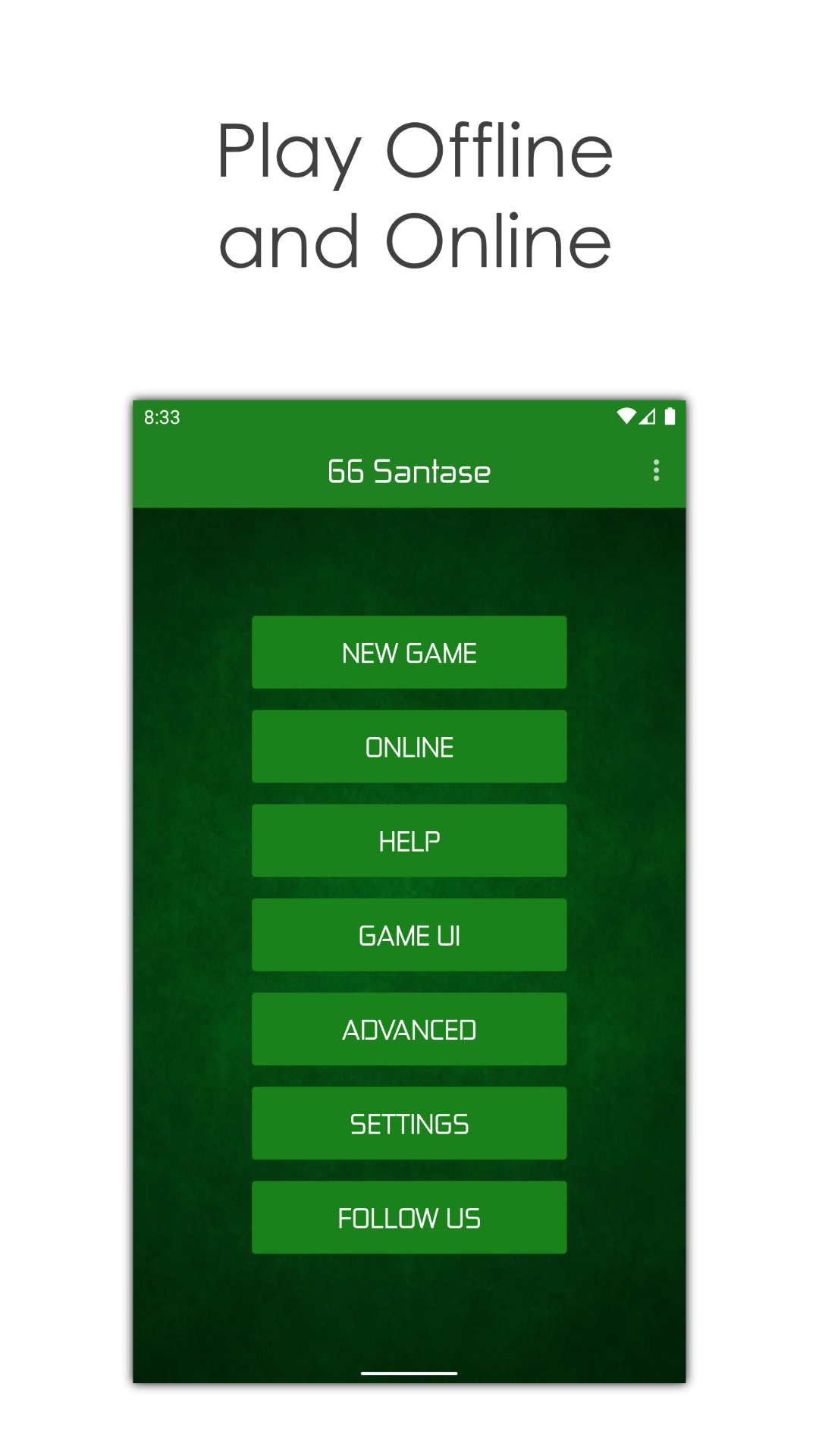This is card game played with 24 cards. In some countries it's called "Sixty-six", "Santase" or "Schnapsen". See how to play and rules of the game in game help or over the internet. The game is known in different variations. You can customize your settings according to the rules you know (start with 20/40 or not, declare 20/40 with queen only or both - queen and king, show or hide opponents points...). Change the game look according to your needs. Everything is in your hands. Enjoy with improved AI and the best card game experience...