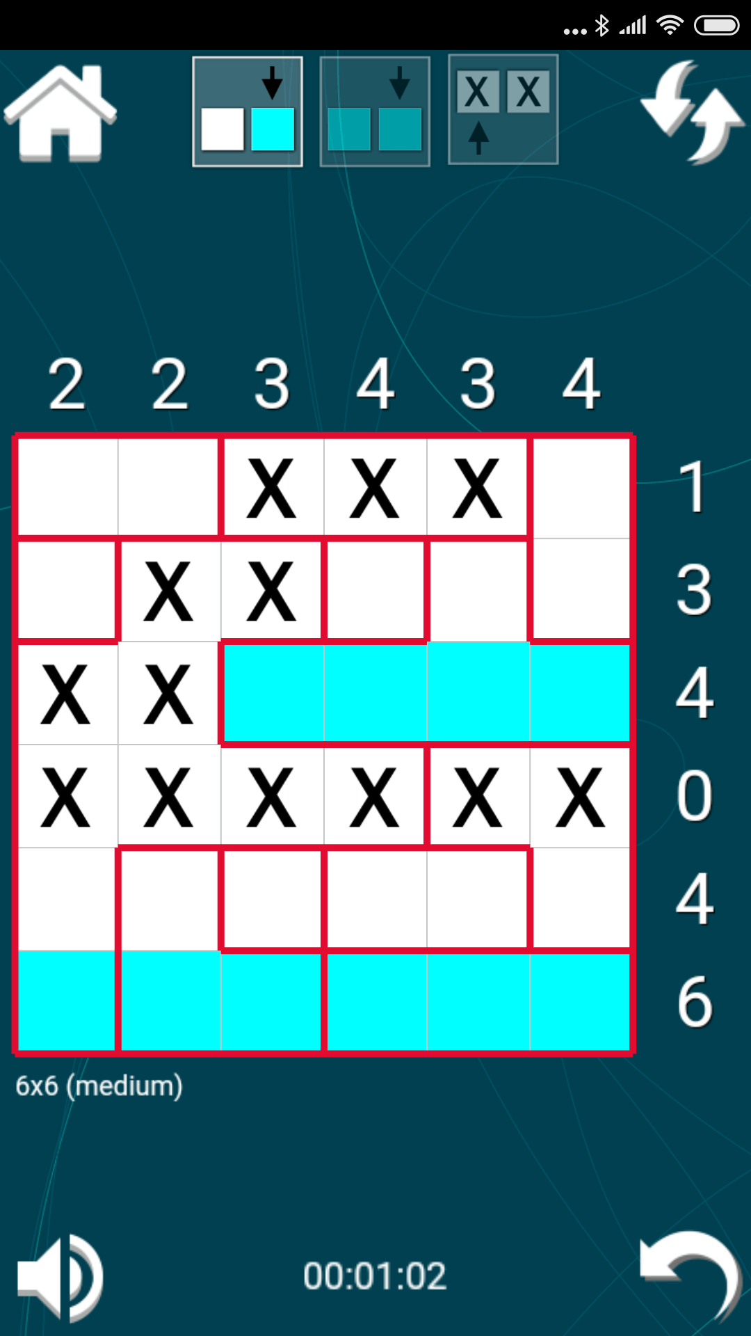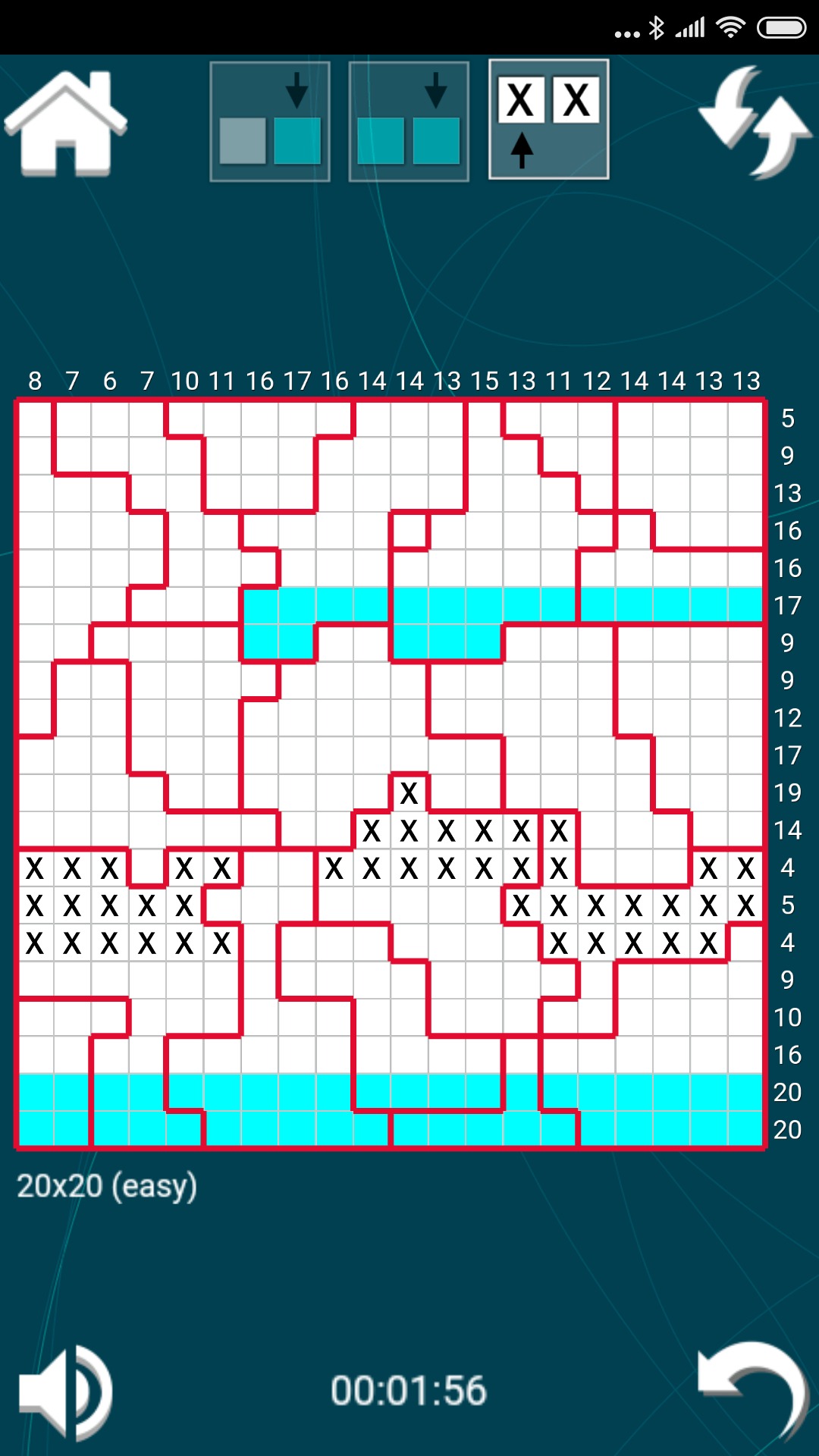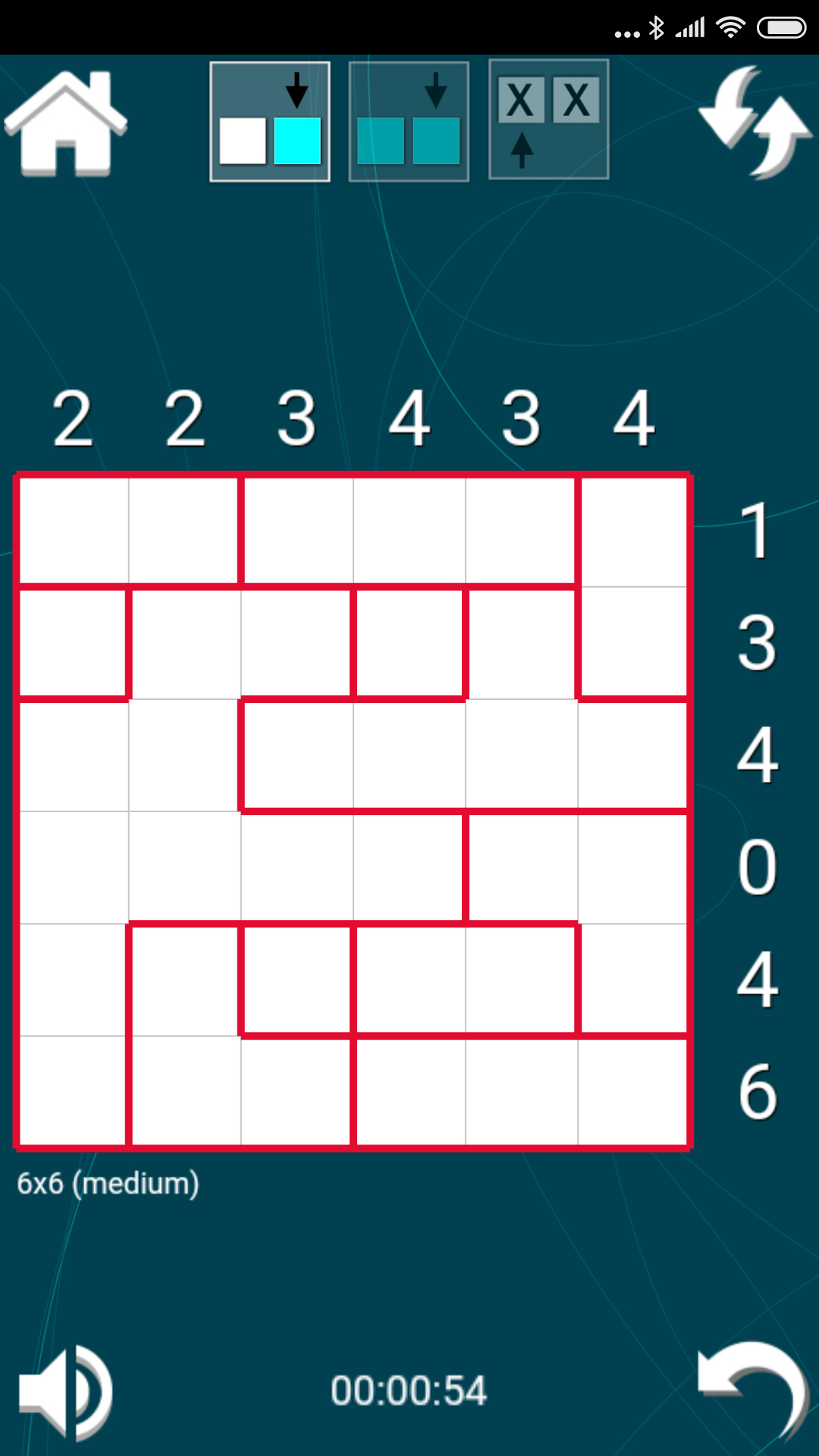 Puzzle contains a grid which is divided in many aquariums which are to be filled with water so that filled water cells count matches the numbers shown for each row and column. Water level in an aquarium must be at the same level across its full width. Aquariums can be filled completely, partially or kept empty.