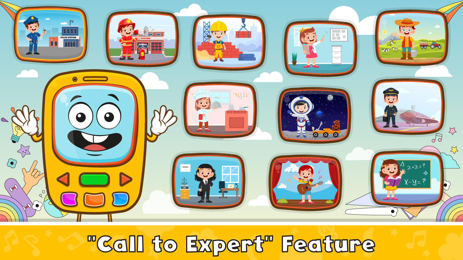4). Develop communication skills and motor ability in toddlers with the “calling the professional” feature. Have conversations with Engineer, Farmer, Policeman, Fireman, Doctor, Chef, Pilot, Astronaut, Teacher, Singer, and lawyer.