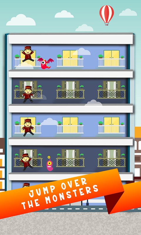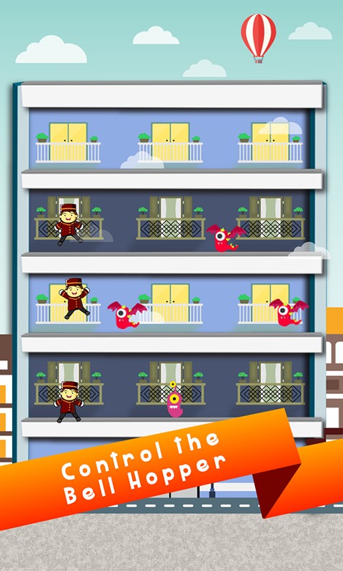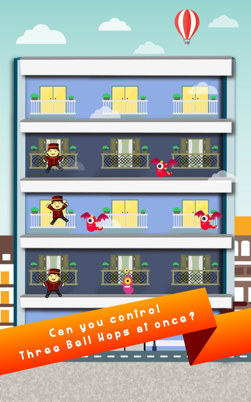 Welcome to Bell Hopper! You play as the bell hop in a hotel filled with monsters. You have to tap a floor to make a bell hopper on that floor jump in this game, but make sure you don't jump onto a monster! Timing is key. Control either 3 or 5 bell hops. There is a leaderboard for both the 3 and 5 floored games. This game is compatible with Android phones and tablets. Download Bell Hopper today!