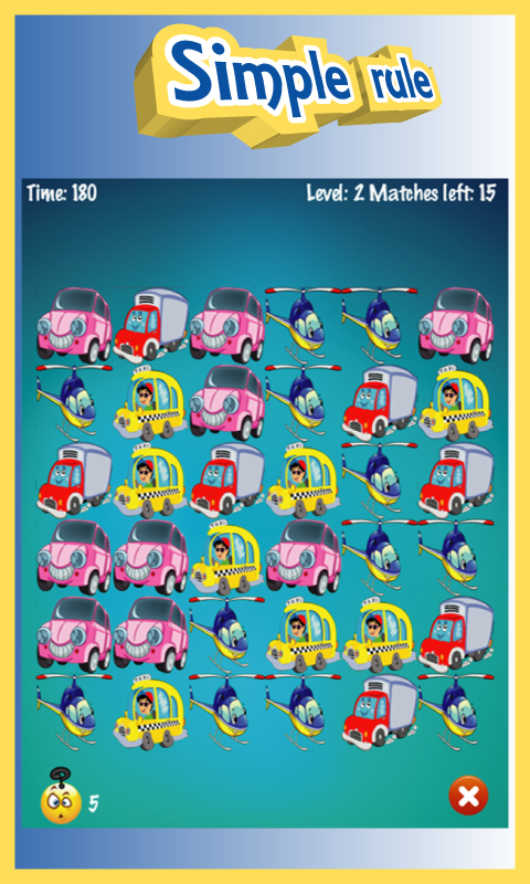cars Matching game is one of the most addictive matching games you will ever play, a thrilling and amazing cars experience for all match 3 puzzle fans! Match at least 3 of the same cars and reach number of matches for passing level..