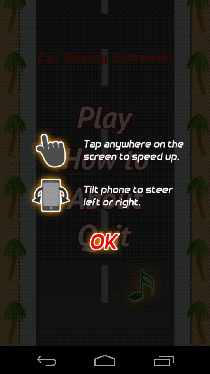 Car Racing Extreme! Is an all new free racing game! This is a racing car game with tilt action! Simply press the screen for speed and tilt your phone from side to side to steer your car. This game is all free and fast downloading! This is also an easy racing game for kids.