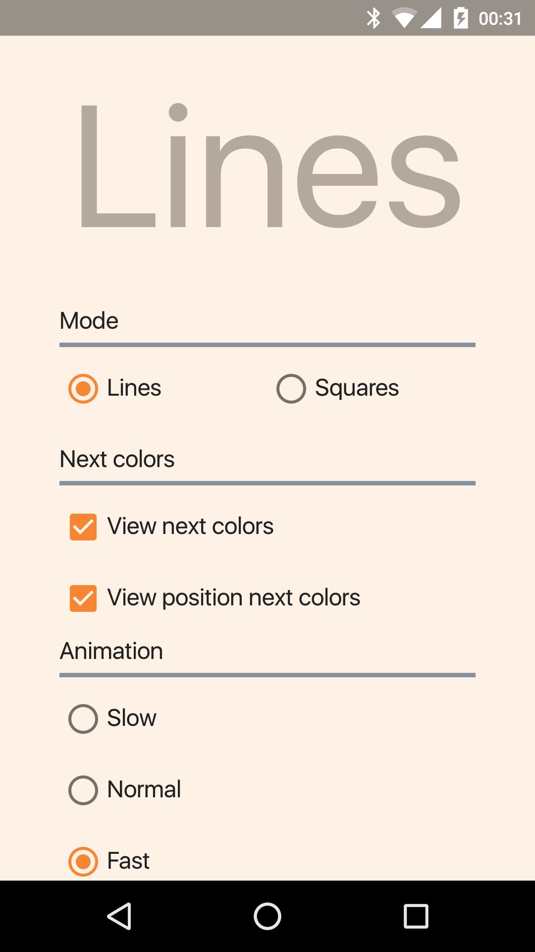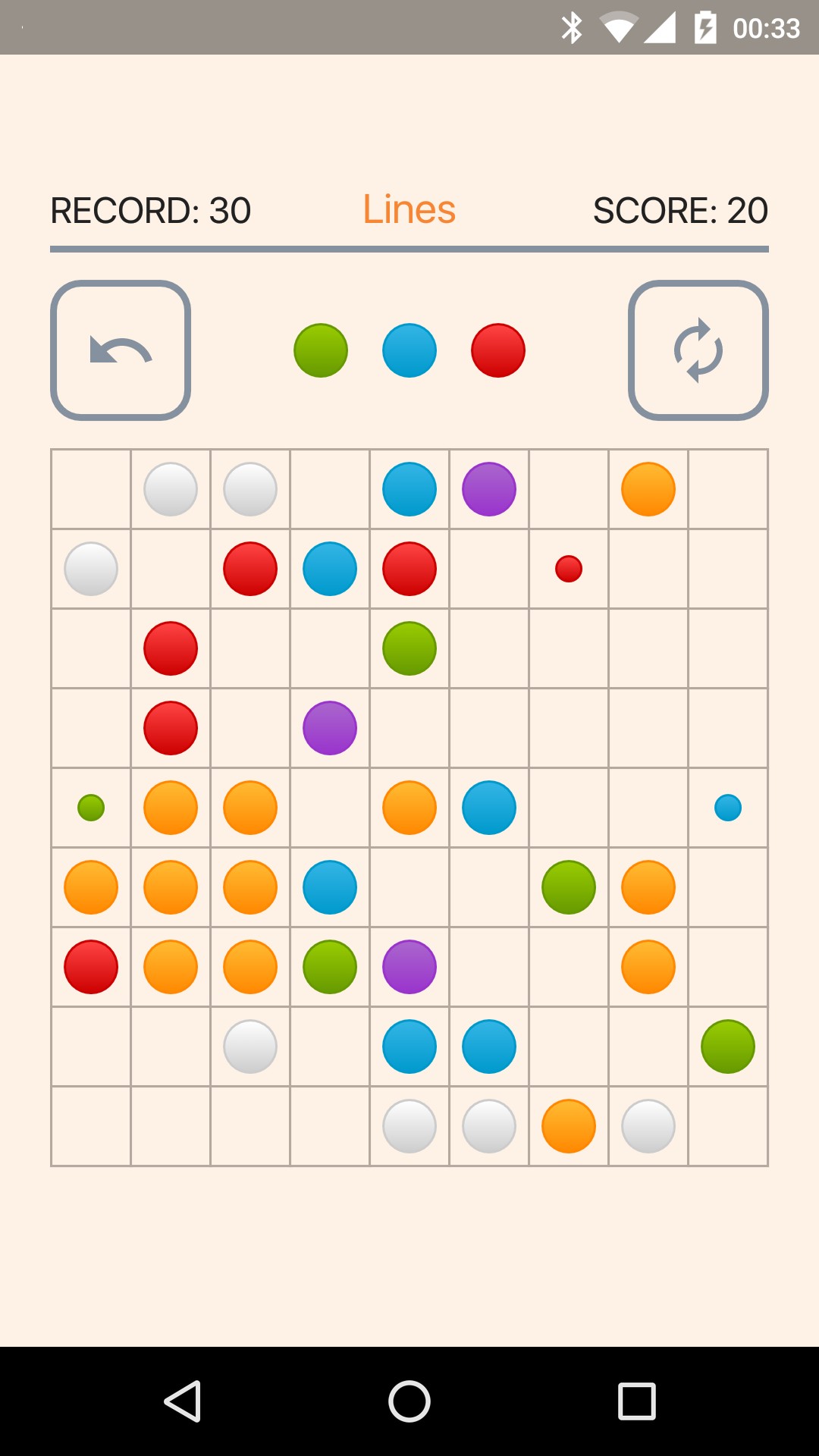 The game starts with a 9×9 board with three balls chosen out of seven different colours. The player can move one ball per turn, and the player may only move a ball to a particular place if there is a path (linked set of vertical and horizontal empty cells) between the current position of the ball and the desired destination. The goal is to remove balls by forming lines (horizontal, vertical or diagonal) of at least five balls of the same colour. If the player does form such lines of at least five balls of the same colour, the balls in those lines disappear, and he gains one turn, i.e. he can move another ball. If not, three new balls are added, and the game continues until the board is full.
