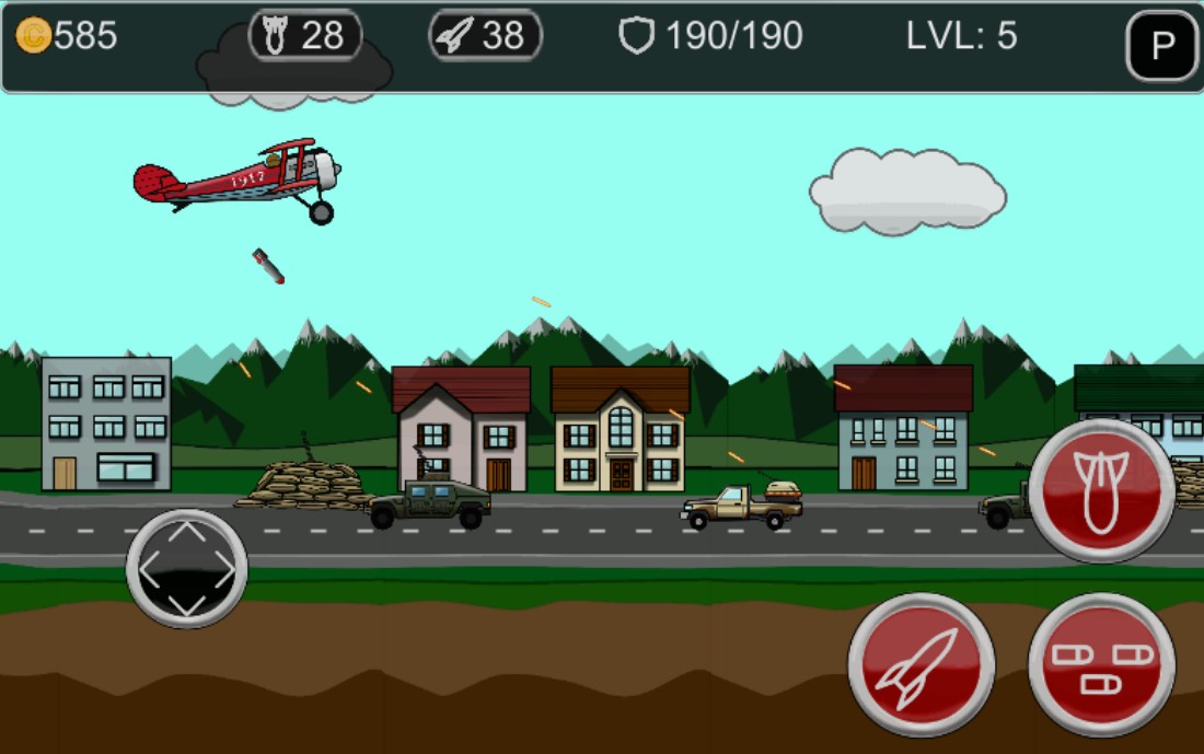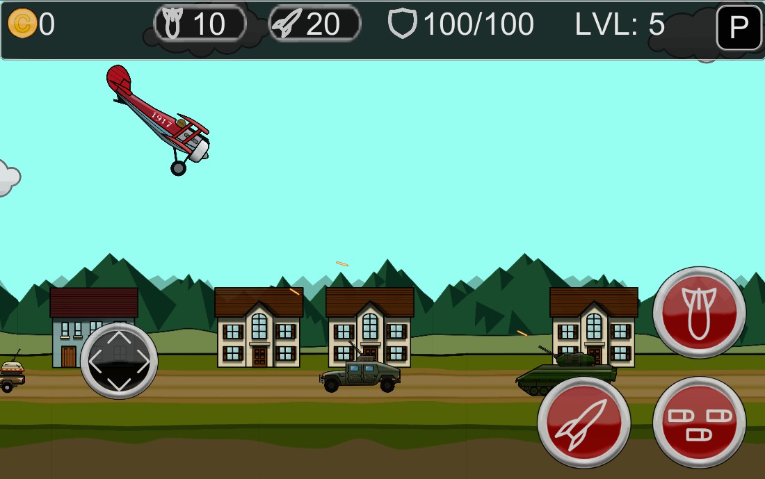 In this insane game you control air fighter, with tons of bombs, rockets and bullets. You have only one objective – destroy as much as you can. Earn scores for destruction and spend it to upgrade your plane, or to buy brand new one. Destructible buildings, enemies vehicles, and bunkers, 3 upgradable airplanes, lots of ammo and fun waiting you!
