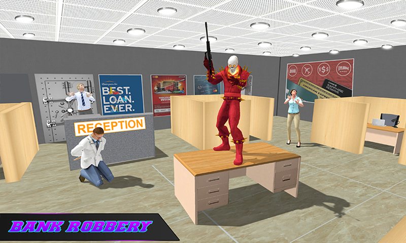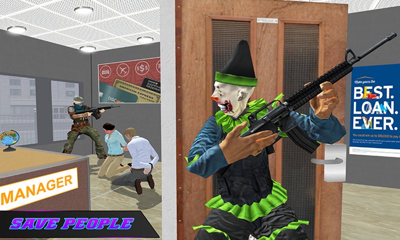 Get ready for the action and shoot the thugs or robbers which are trying to rob the city bank in this Clown Hero Heist City Bank Robbery game. Some decent teens have joined the evil world in order to survive with their high level desires and greed of money. You play this fighting simulator as scary clown squad and save the innocent civilians which are stuck in the city bank. Fight with bank thugs but beware from these dangerous criminals and save the bank hostages.