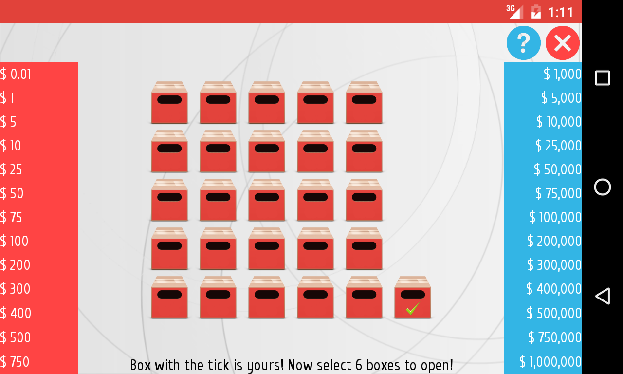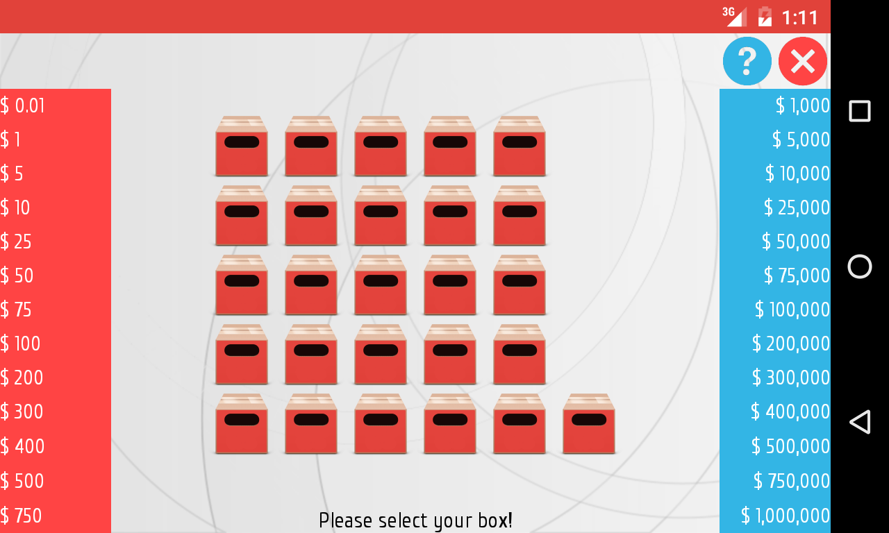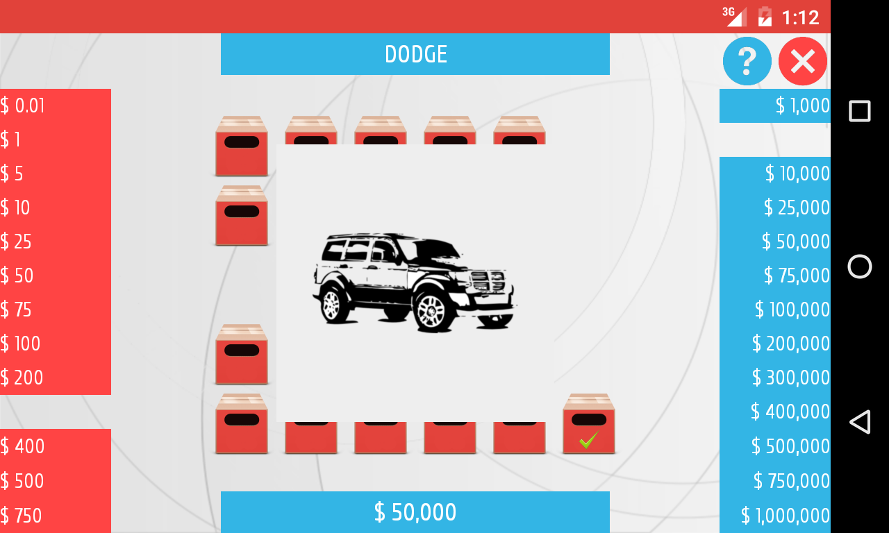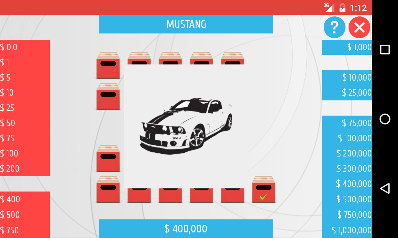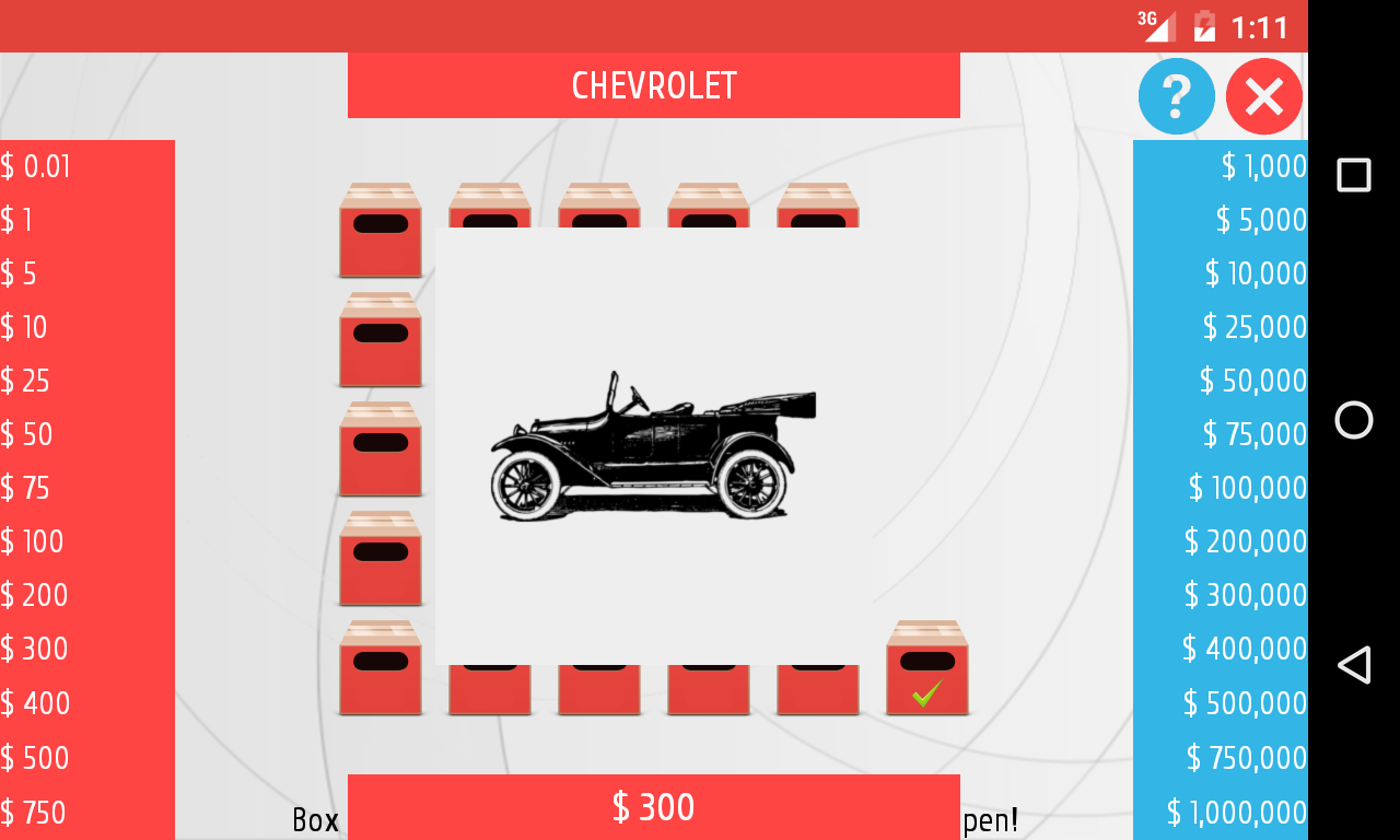 This game is similar to a popular TV game. At the start you pick your box, and then open boxes one by one. Every box contains money or car. Occasionally the banker will give you offers. You can pick the money, banker gives you, or continue playing until you get what's in your box. Enjoy and win a lot of money, or a brand new car...