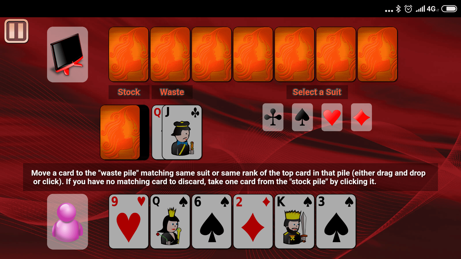 In each turn player is supposed to discard one or more cards. If player has no matching card to throw, he/she must pick a card from the stock pile. Player can discard a card only if it matches either the rank or the suit of the top card in the waste pile. There are additional rules which must be followed while discarding a card.