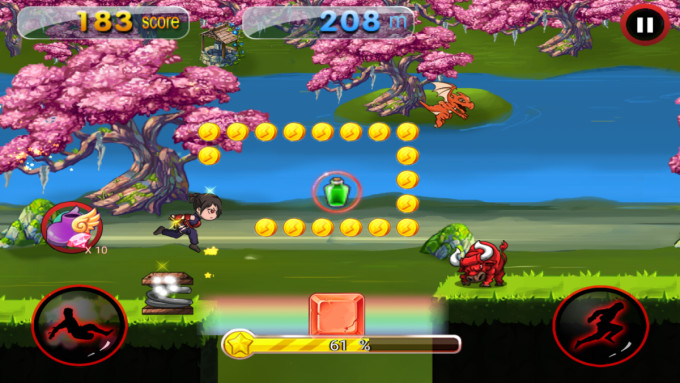 Do you think being a Ninja Champion is easy? Run, slide and jump through challenging levels and race your way to the top of the league. Beware of flying shurikens and booby traps, such as spiky bamboo, walls and holes. Watch out for the lurking angry red bulls, as they will try to stop your quest! Overcome countless booby traps, defeat enemies, and avoid the deadly shurikens; this is the play rule in this fun game. Grab shields, flying rockets, power-ups, giant potions, magic wands, springs, rainbow bridge, flying stars and powerful magnets. You have to be strong, fast and be stealthy. Collect gold and gems to upgrade your ninja power ups, you can also gather mounting animals and pets to strengthen your skills. Be the ultimate shadow ninja!