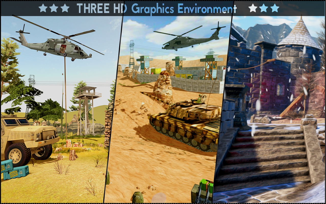 - Play in multiple shooting environments or battlegrounds, from huge mountain environment to beautiful offroad environments.