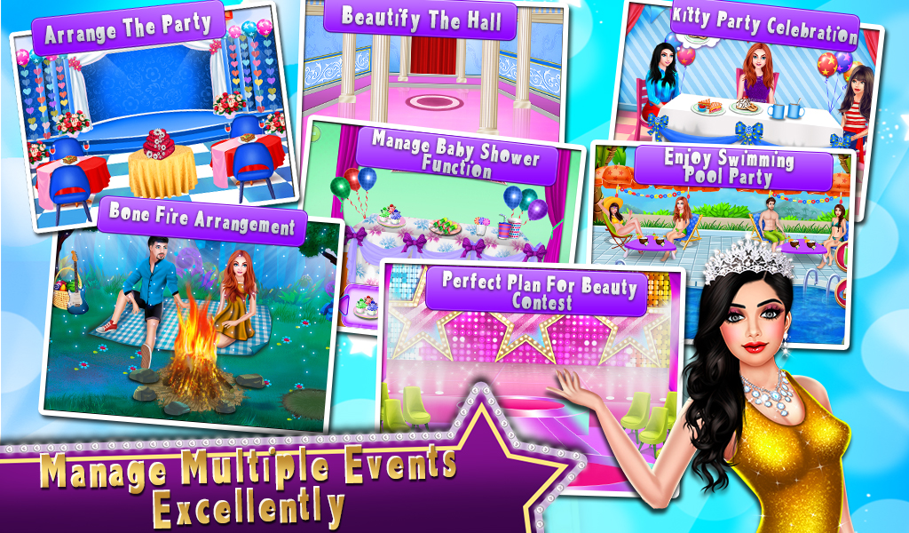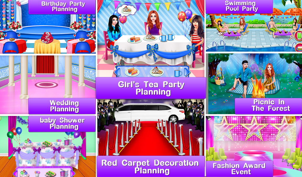 During wedding planning, you have to organize awesome activities like church decoration, ring ceremony, wedding cake decoration. Next is the baby shower function and you have to perform some activities like guest list preparation, room decoration, baby shower decoration and photo shoot of the couple. Now it's time to arrange some cool swimming party and make it more exciting thing with the amazing theme, balloons and etc. We have to arrange girl's tea party with amazing decoration and play mini-games during the party.