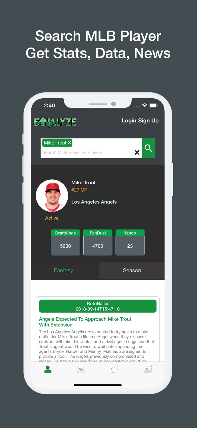 SEARCH 2 or more NFL football or MLB baseball players to get a side by side analysis with weekly graphs to view trends, season stats and exclusive stats to help you start the best player for each week.