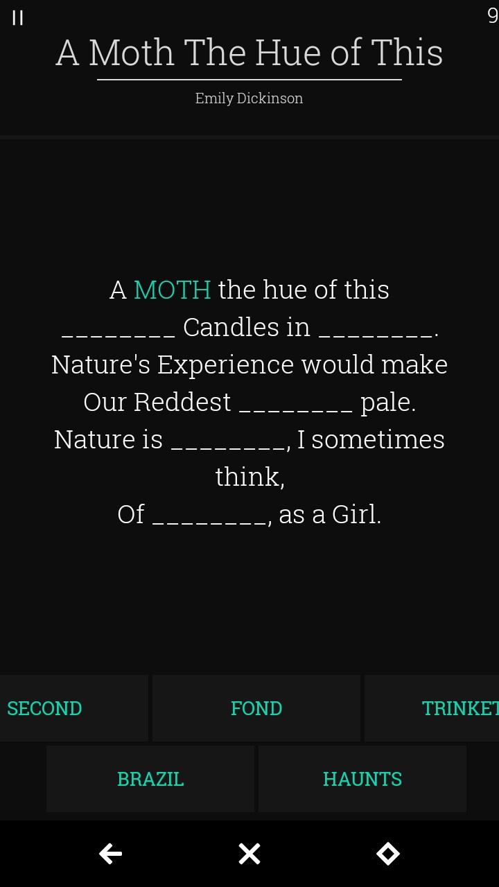 Fill In The Blanks game-play is as simple as the name suggests. Simply try to fill in the blanks using the provided words to solve the short story or poetry puzzle. The Exciting thing about FiT B is the ability to learn some amazing Poetry and Stories written by some of the greatest poets of all time. Just to name a few Authors that Fill in the Blanks Puzzle contains