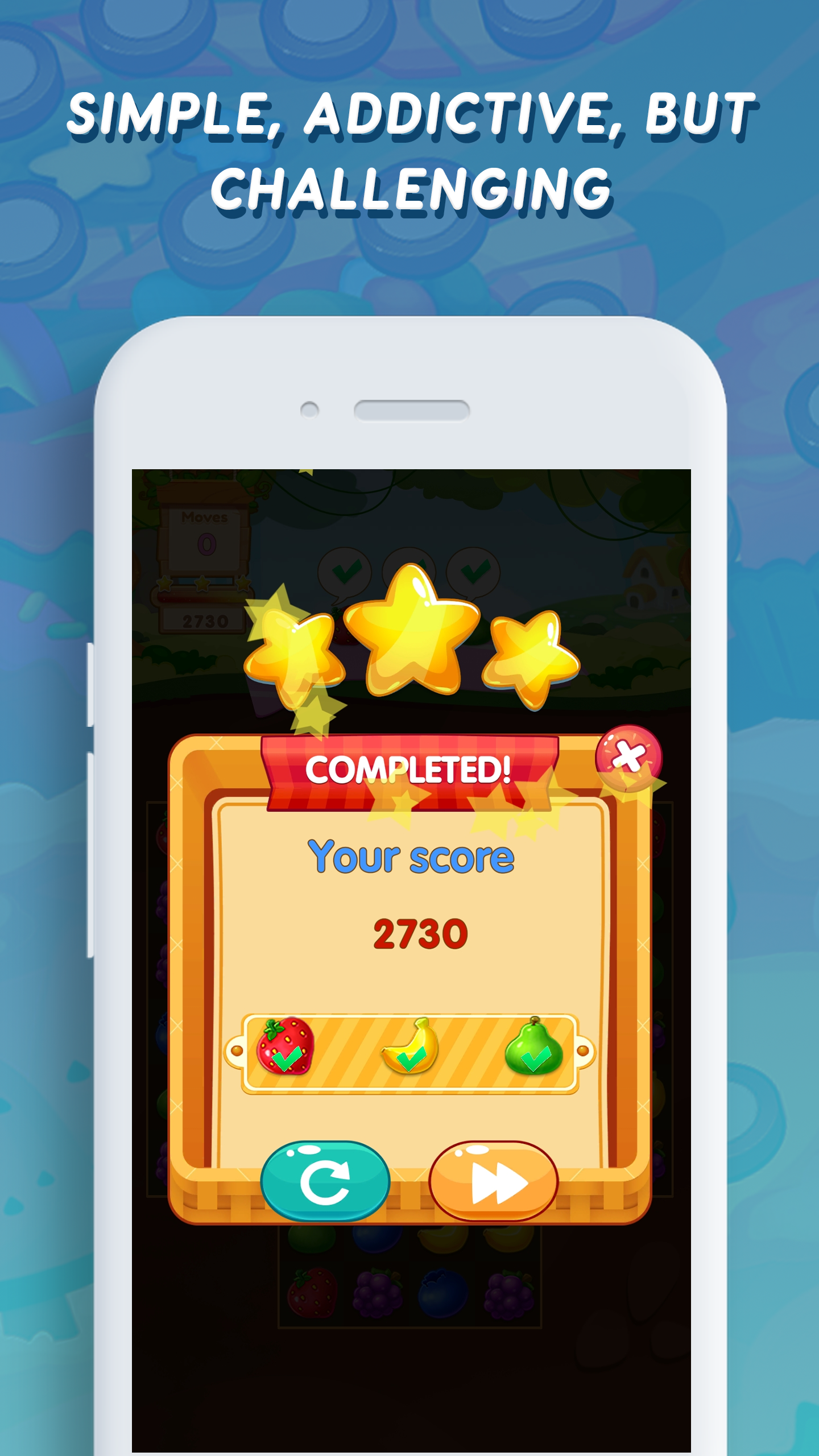 The gameplay is simple: slide to match 3 fresh fruits or more to blast them. Keep blasting them to meet the levelโs objective. As your game progress, the levels will be more challenging and exciting. You will find lots of cool fruity twists in this match 3 game so you wonโt get bored.