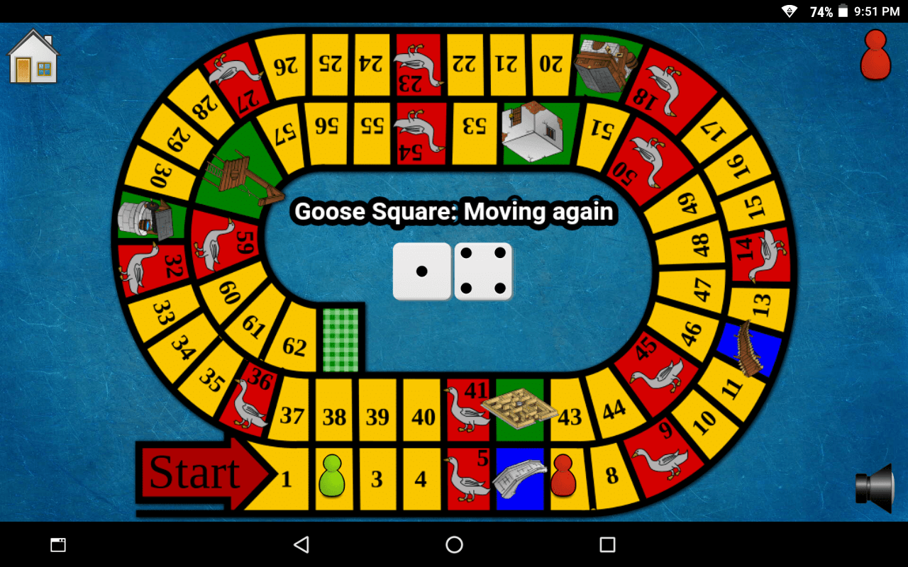 Game of Goose is a simple race game played on a spiral shaped board consisting of 63 squares. The game is mostly played in Europe and seen as family entertainment.The objective of the game is to be the first player to reach to 63rd square in the board. The game can be played with one pair of dice and by up to 4 players each player having one distinct colored piece.