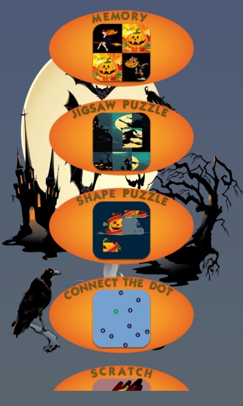 Set of children's games for Halloween includes 15 puzzle, arcade and decoration games: Jigsaw Puzzle, Shape Puzzle, Connect the Dot, Memory Game, Advanced Memory Game, Scratch game,Repeat game,Rotate puzzle, Pumpkin Decoration and Catch the Pumpkin.