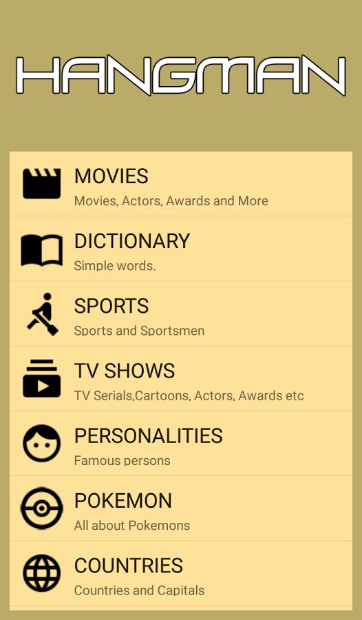 Save the good old Hangman by correctly guessing the answer on the basis of the given hint or clue. Each incorrect attempt costs you a chance. You lose when you run out of 8 chances. Clues are free for this version.