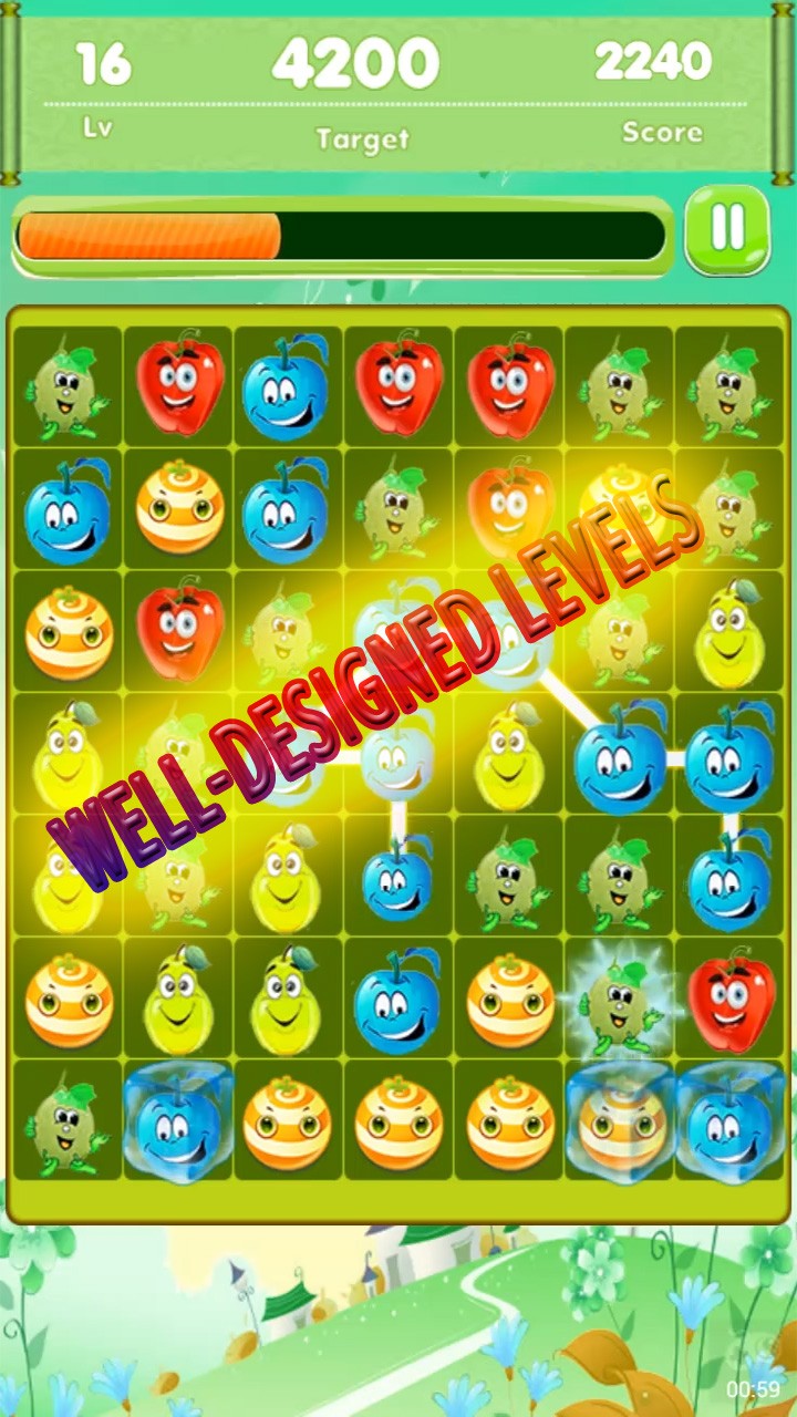 Happy Fruit Connection 2016 relax a simple and addictive game. so that the same fruits longest chain in this game exciting special powers. There are at each level, you collect fruit chain stores to fill these goals, all levels of the target will be eliminate when you pass this level of different targets.