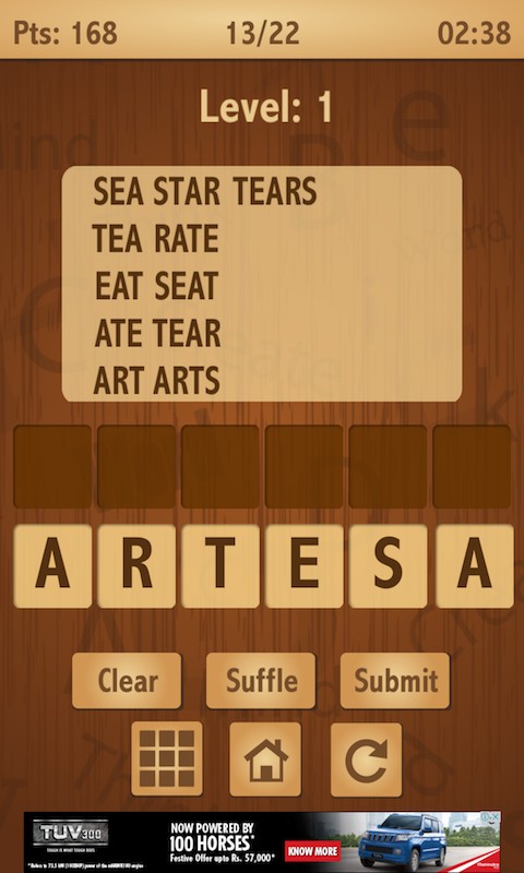 Pickup words from random characters and spell as many 3, 4, 5 & 6 letter words as you can before the timer run out. So beat the clock and spell as many as words you can.