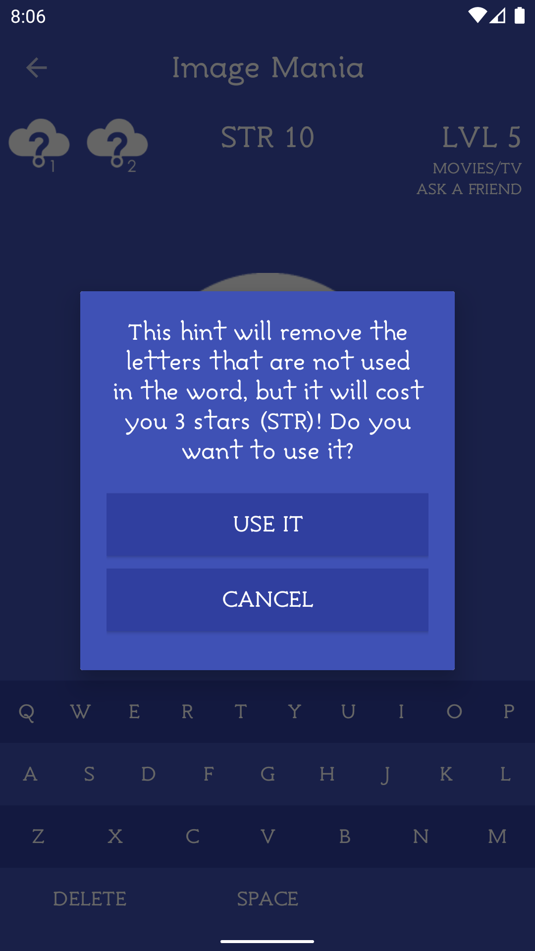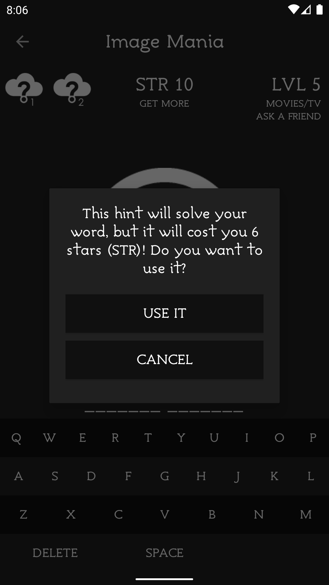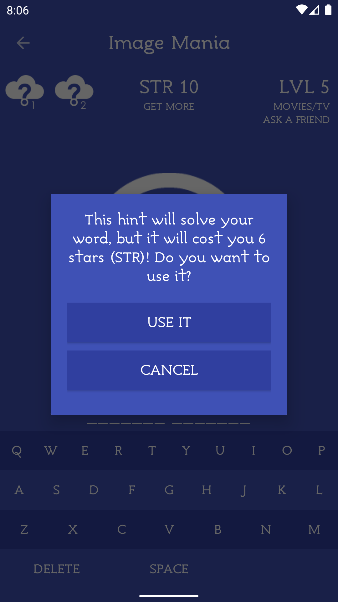 This is Image Mania. The game will show you different images of movies, celebs, song names, music artists and other stuff in different categories. Your goal is to guess the words hidden behind the image. If it is hard for you to guess any of the items, just use one of the hint buttons in the upper left corner. It will cost you 3 or 6 stars (STR), but don't worry, every guessed image will give you a new star. If you want, you can ask a friend for help. Enjoy and try to guess them all!