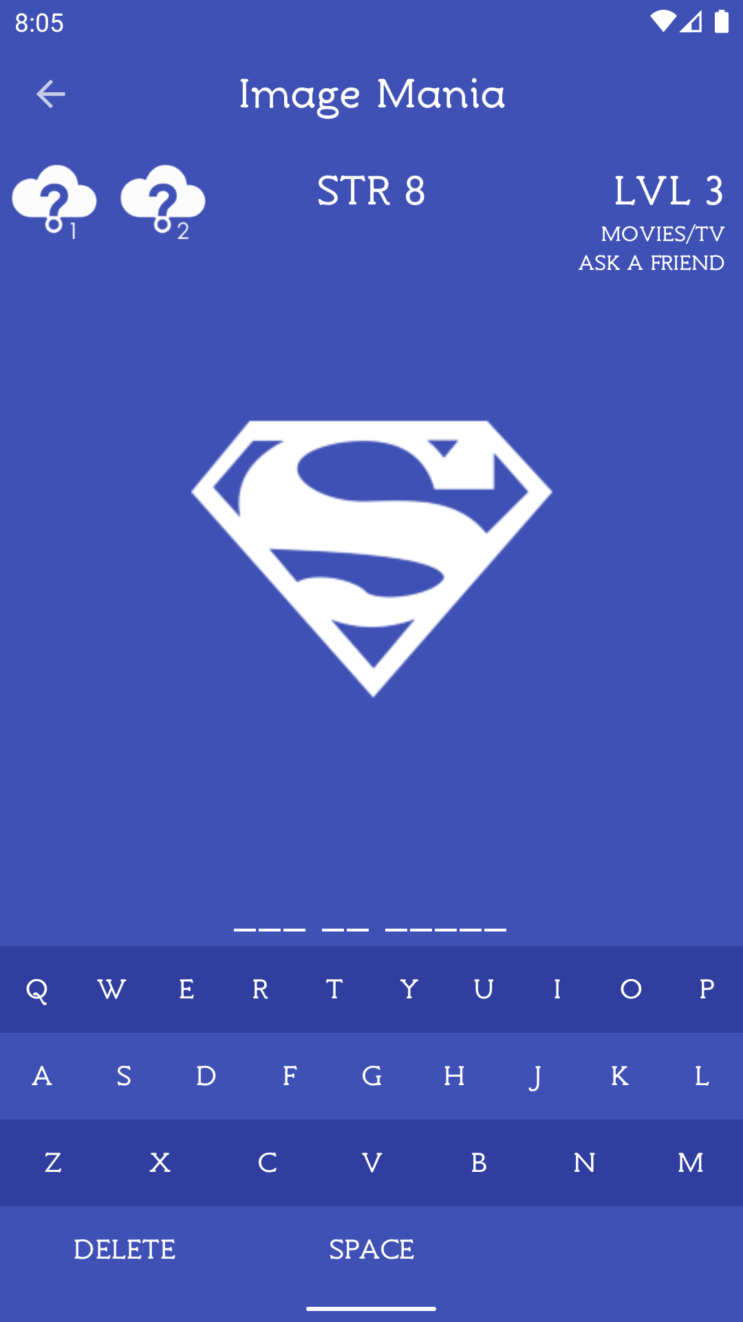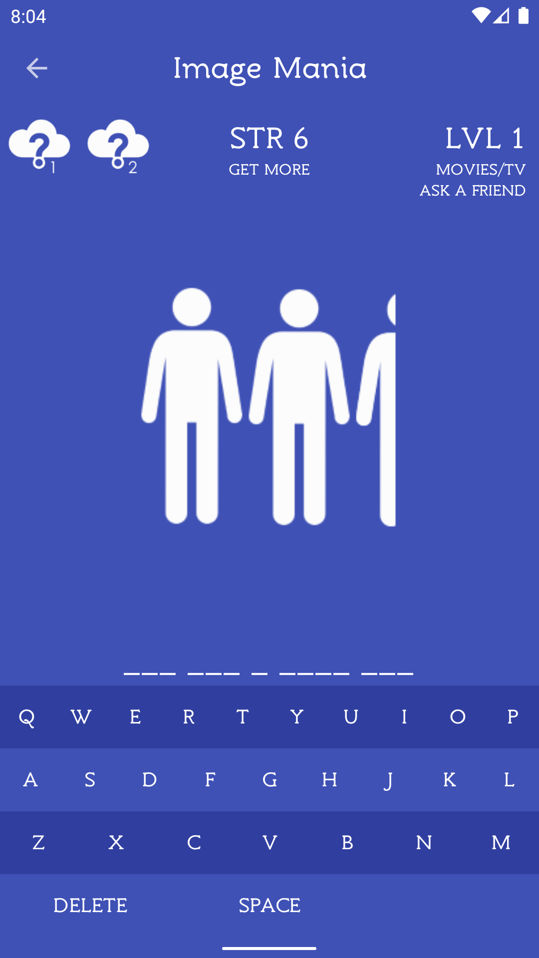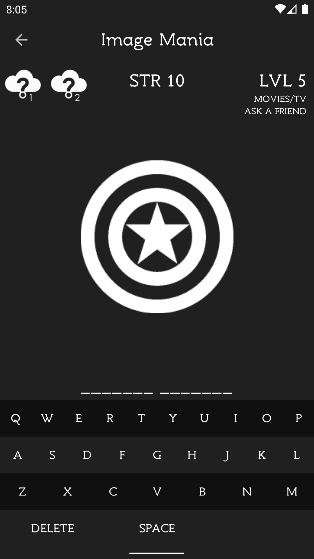 This is Image Mania. The game will show you different images of movies, celebs, song names, music artists and other stuff in different categories. Your goal is to guess the words hidden behind the image. If it is hard for you to guess any of the items, just use one of the hint buttons in the upper left corner. It will cost you 3 or 6 stars (STR), but don't worry, every guessed image will give you a new star. If you want, you can ask a friend for help. Enjoy and try to guess them all!