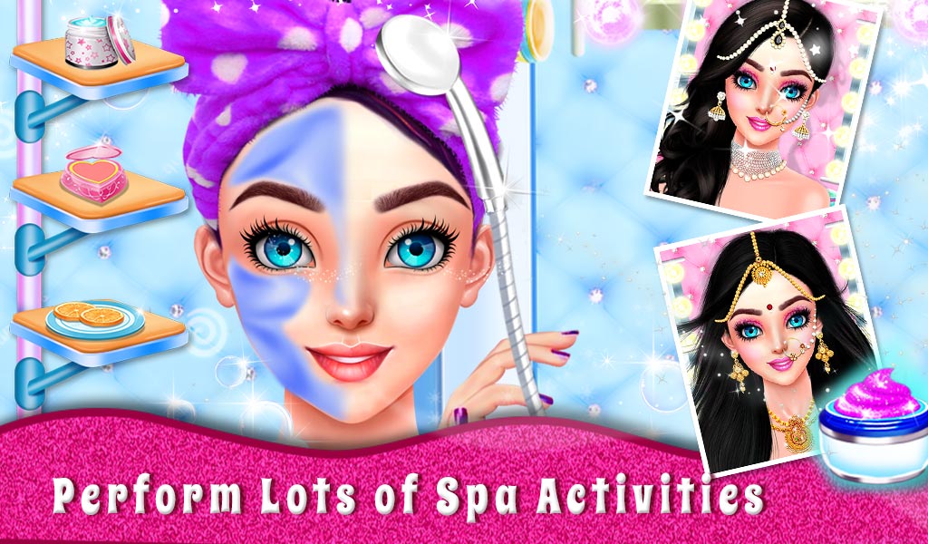 At the beginning of girls makeover game, take her to the spa treatment and apply shampoo, cream, face pack, shower and much more salon accessories in this girls game. After that, remove her pimples, shaping up eyebrows, use a blower to dry her hair, tied it with use of ribbon and much more activities in this Indian girl fashion salon game. Don't forget to perform Manicure & pedicure for her. Then select your favourite mehndi design & jewelry accessories for decorating her hands & feet.