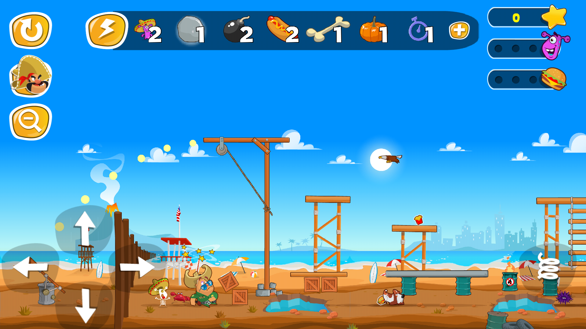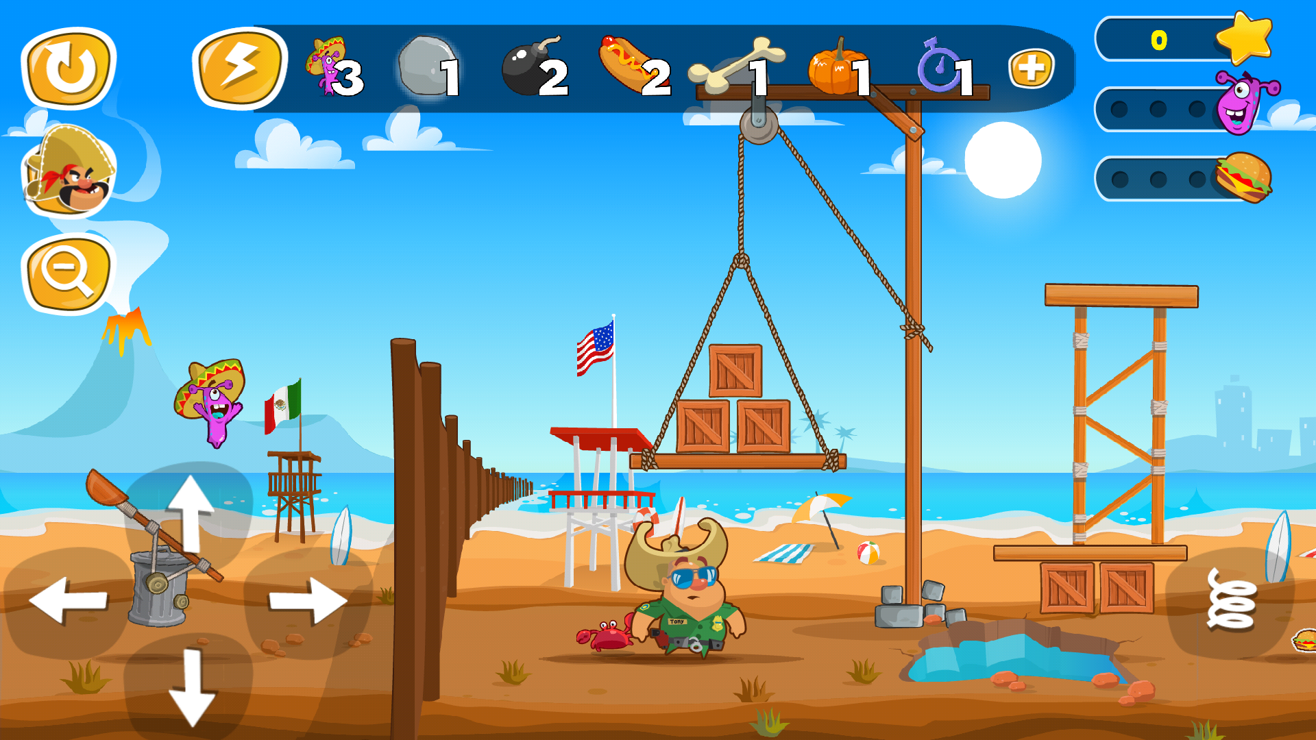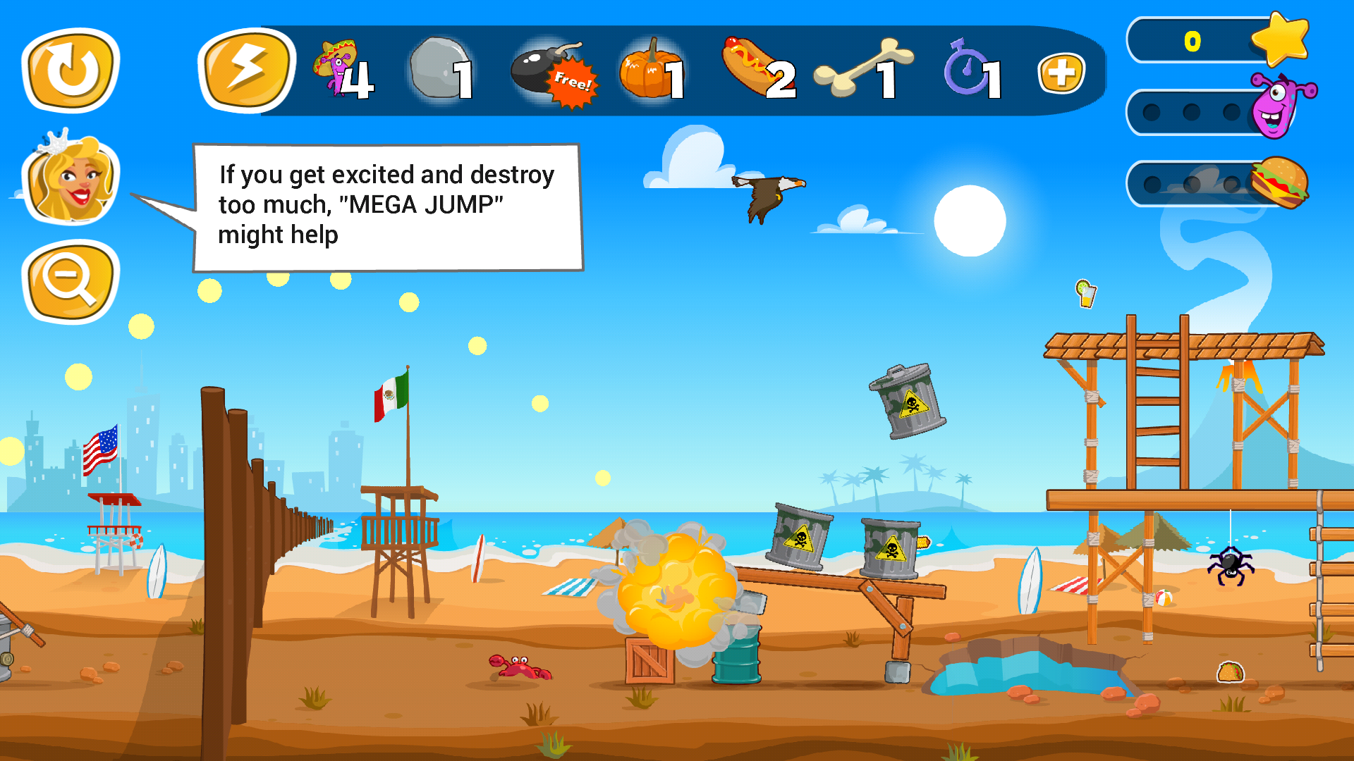 Pick your side (Mexico or USA), catapult the aliens to the other side of the Wall and control them to eat all food and then reach the escape vehicle. To help you overcoming the obstacles and opponents, you will be able to shoot a bunch of advanced weapons like pumpkins or hot-dogs and fight the nature, including wind, holes, rivers...