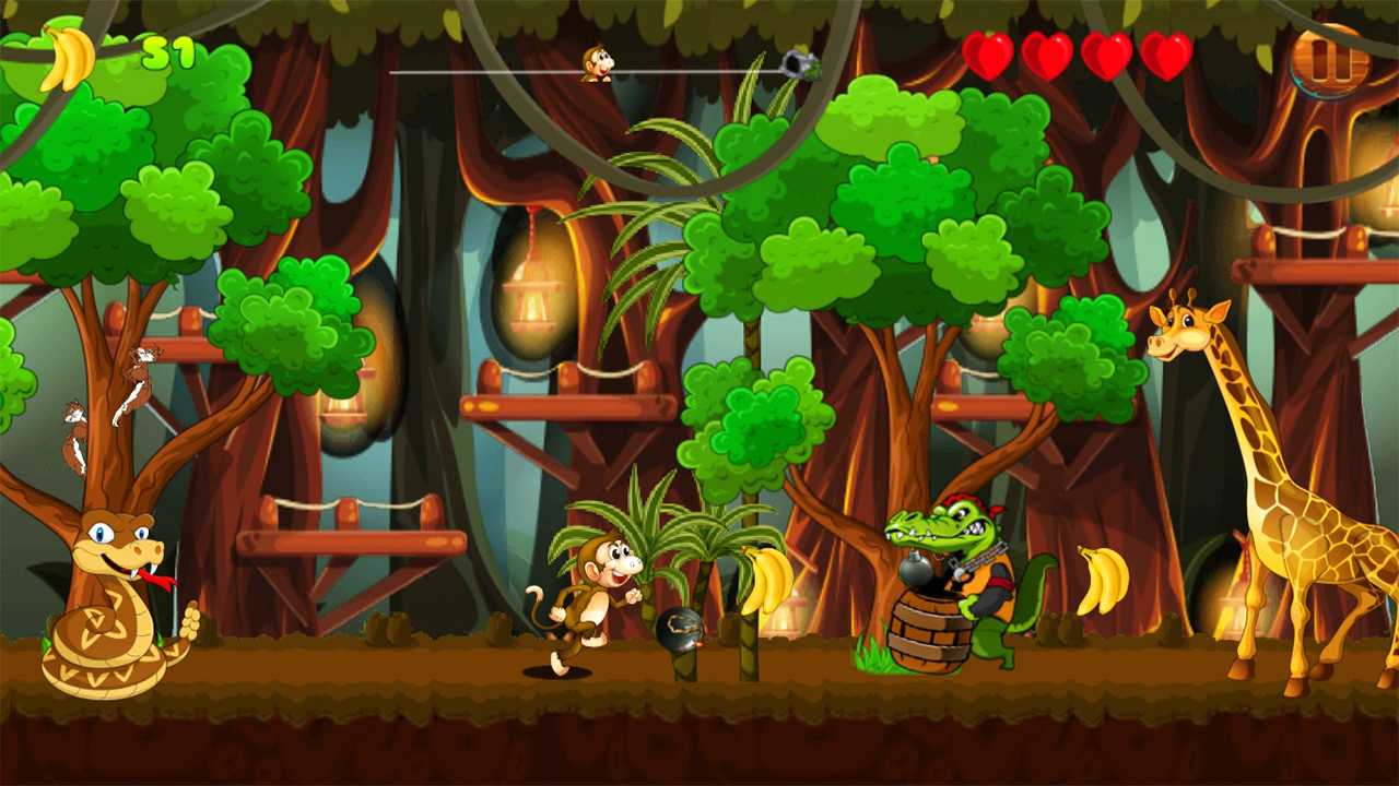 Our little Kong needs run into the jungle and swing through vines and take bananas to reach the monkey kid. Monkey has to take all bananas in a jungle to keep the energy level high,