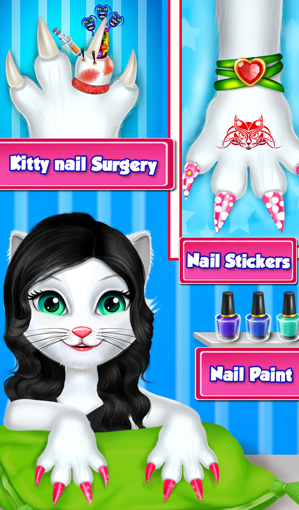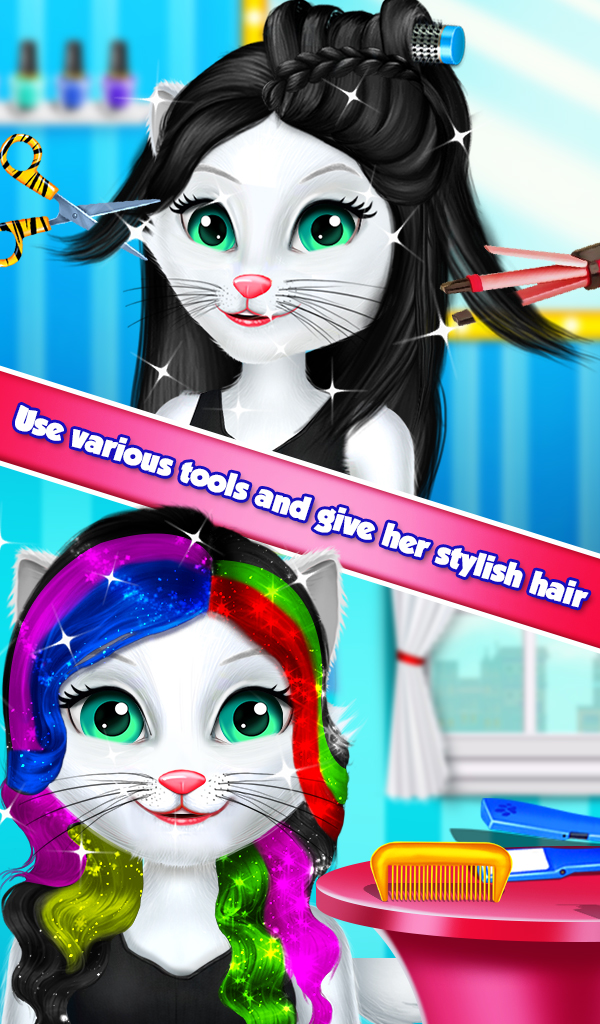 Salon will help you to feel like a true professional artist in the fashion world. Kitty Dream Spa Salon game has some amazing treatment view like nail treatment, hair treatment, beauty treatment and much more. Kitty wants to start with nail treatment. There are various nail treatment in this spa salon game like nail spa, nail paint, nail stickers, and nail surgery. Let's give an attractive look to kitty by doing some hair treatments like hair color, hair salon and hair treatment. Next, Kitty wants a beautiful look and wants to try some beauty treatments so let's perform face spa, face paint and face make up in this kitty makeover game. After beauty treatment, you can perform some tattoo activity like tattoo spa and temporary body tattoo. At the end collect and feed some tasty food to your kitty.
