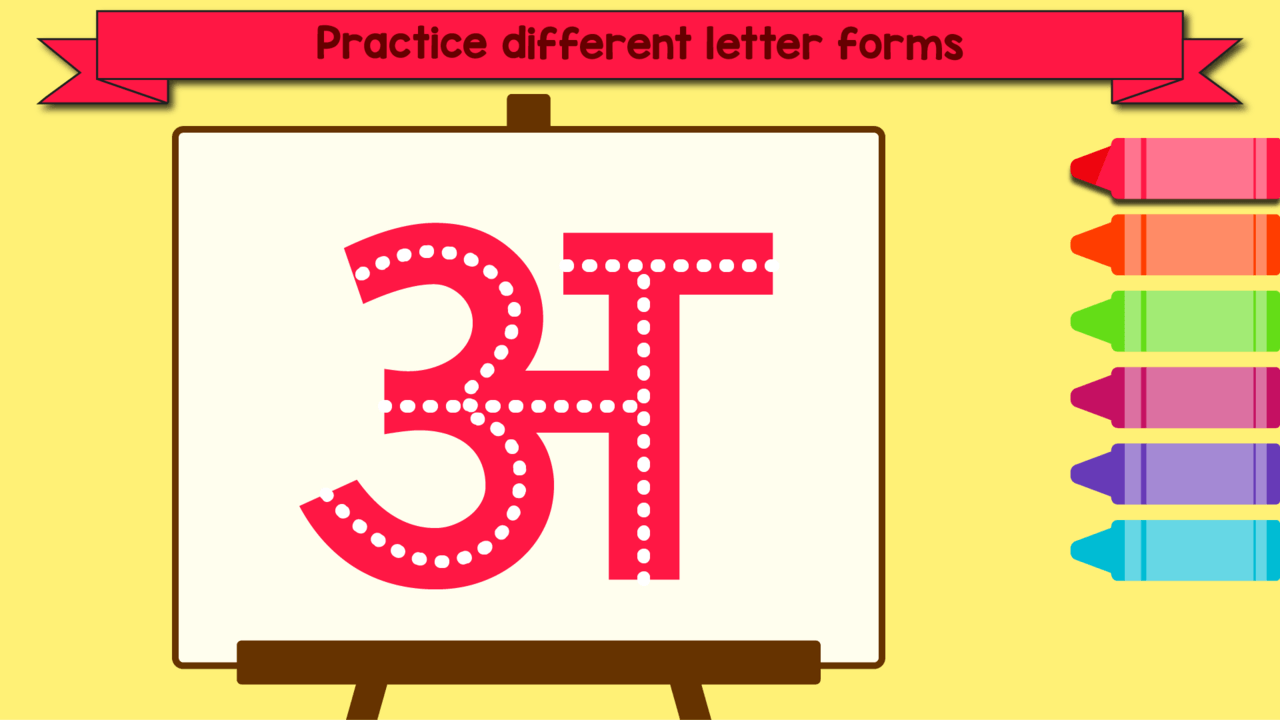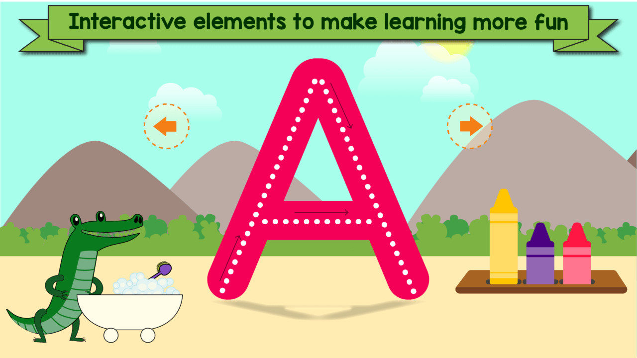 Preschool and Kindergarten kids learn to write and trace standing/sleeping lines, shapes, ABC, Number, Spanish, Hindi Alphabets. Kids also learn the phonetics of English Alphabets while writing. Let kids learn how to write in a fun and interactive way all while they enjoy playing.