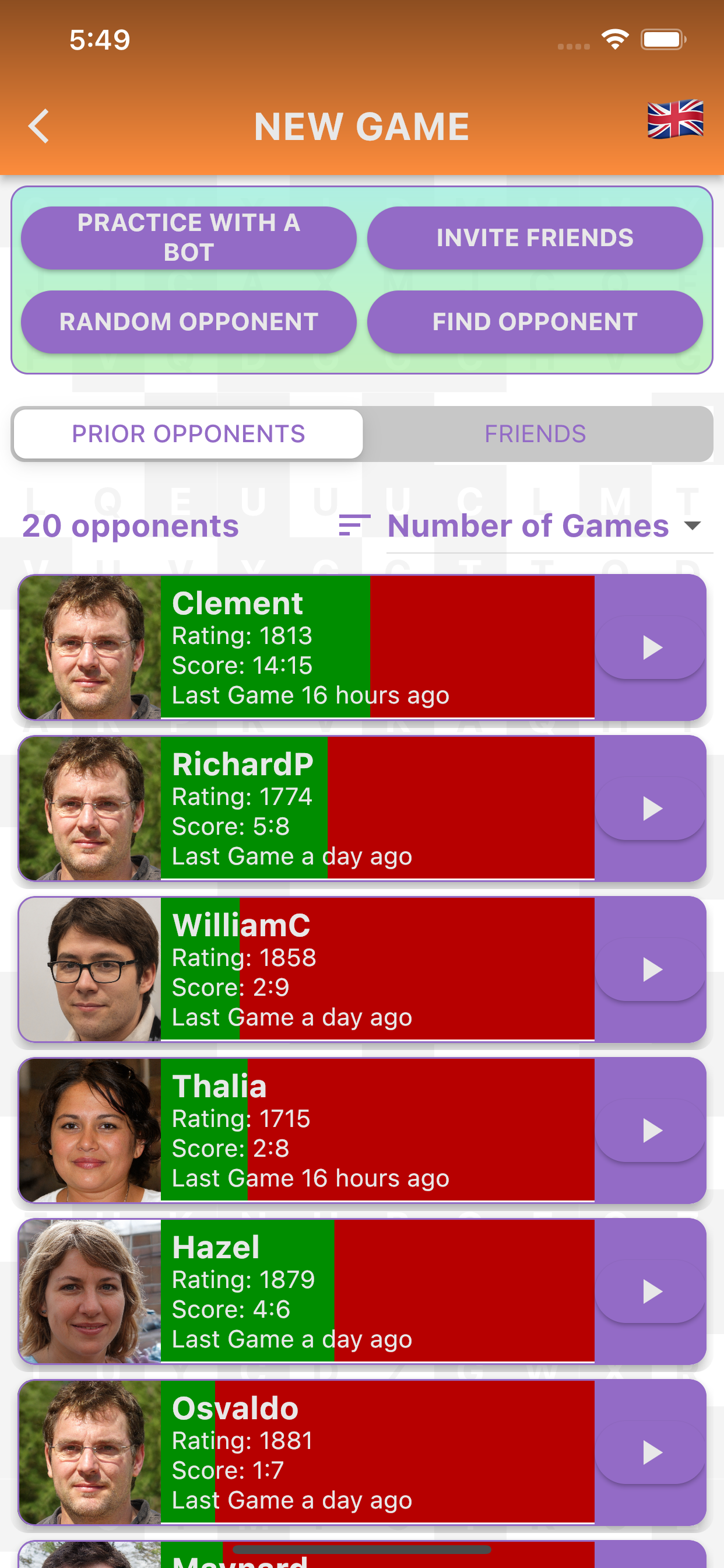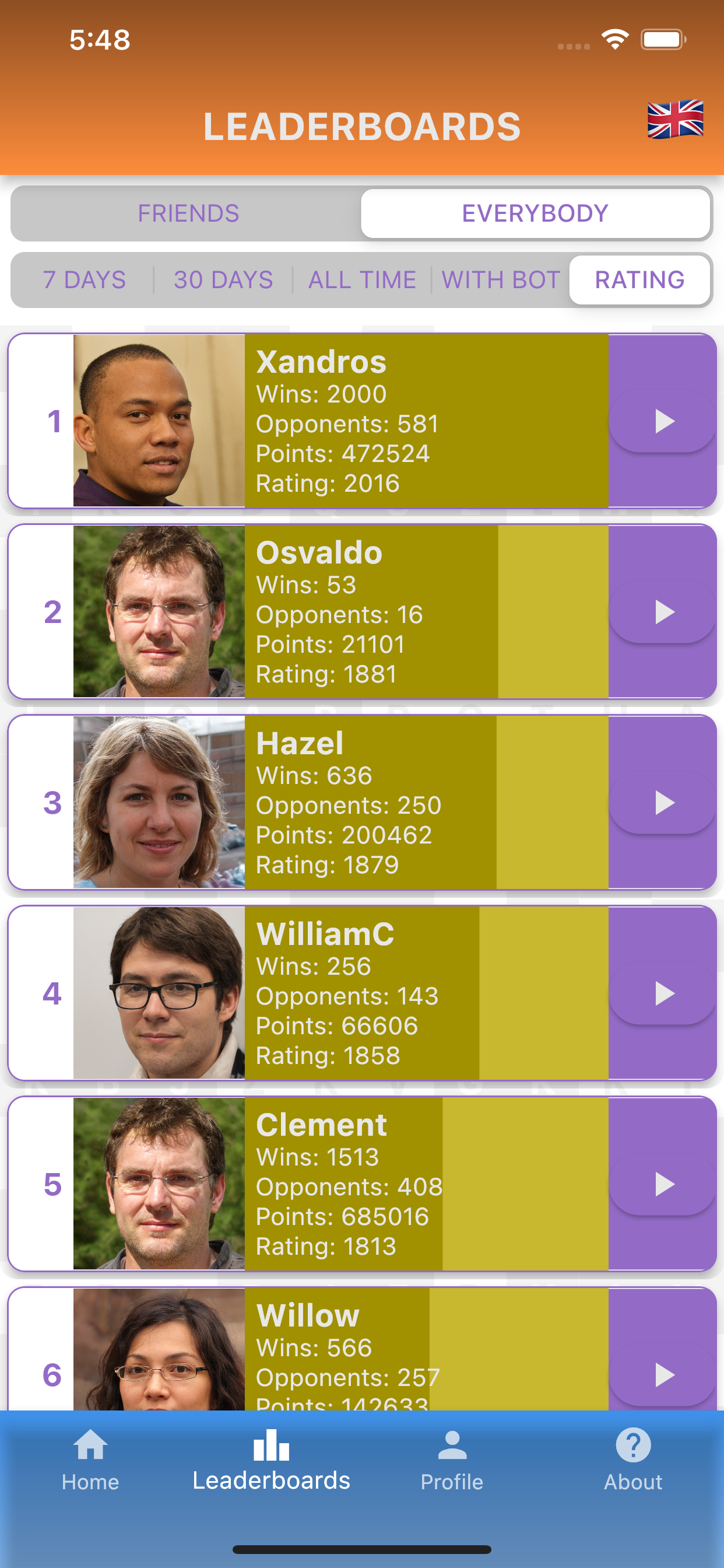 • Leaderboards based on recent wins as well as overall rating.