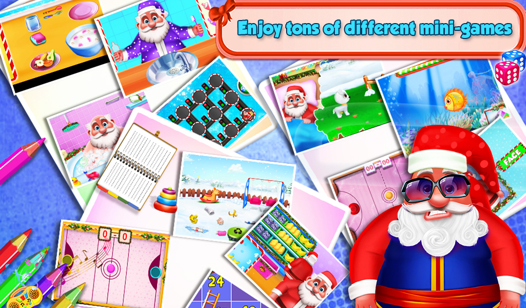Start the game with early morning activities like clock learning, brushing teeth, selecting dress up, fruit cut game and much more. Next, go to school and help Santa to learn various educational thing like Alphabets & Numbers Tracing, Identify animal, Roll the ball game, Identify color, Learn Piano, Arrange the room, Listen & Identify Animal sound, Drag the number and many more.