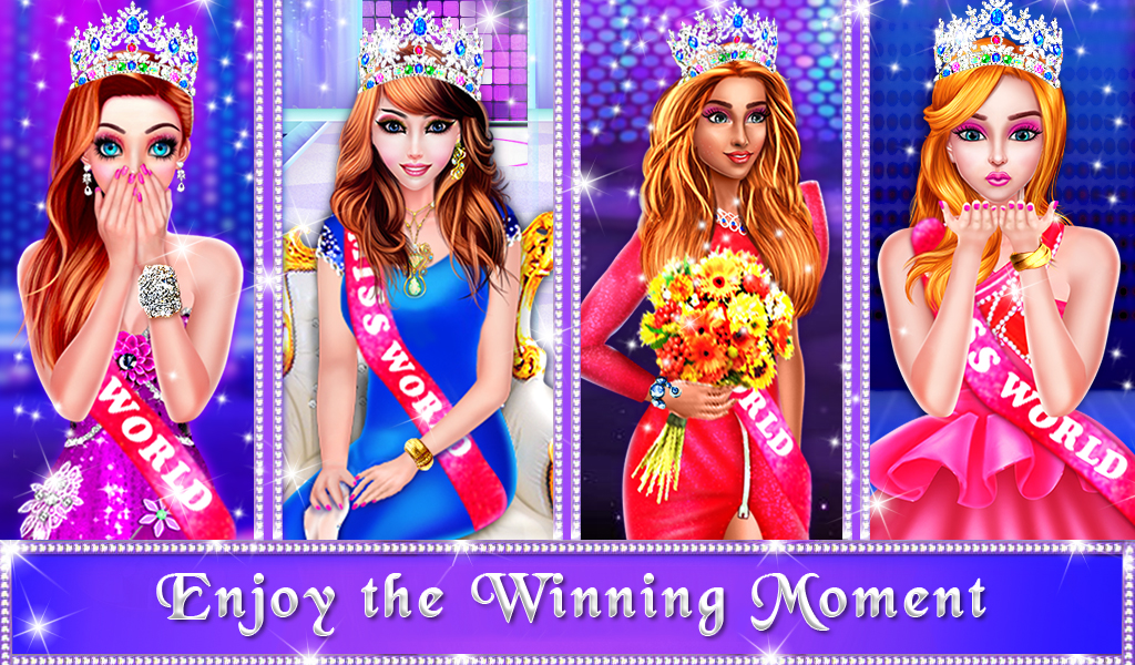 Winners name will be announced by the judges. There will be the announcement of top 3 positions. Winner, 1st Runner-Up and 2nd Runner Up. In this miss world competition game, enjoy the winning moments and a crowning moment with amazing animation.