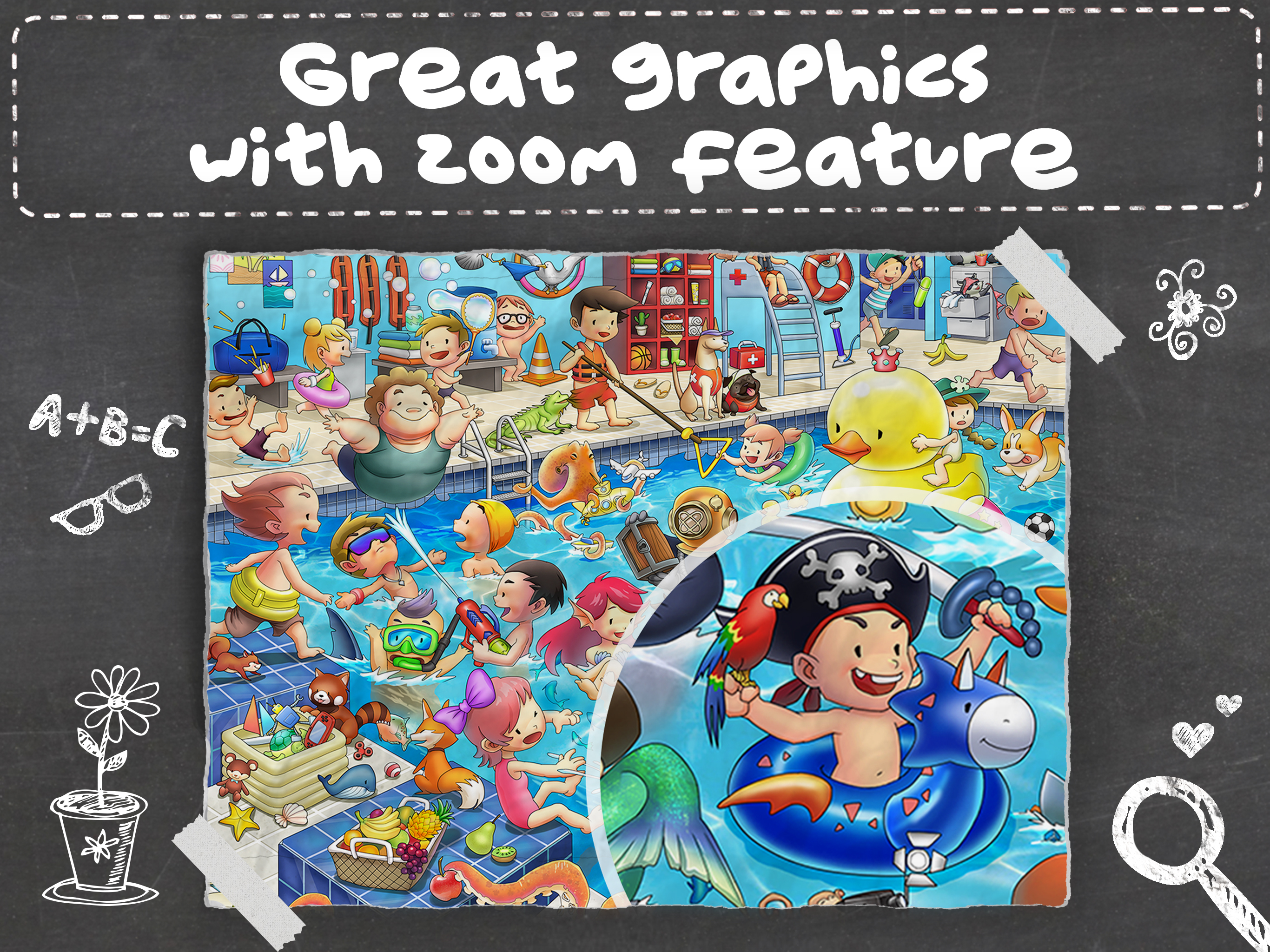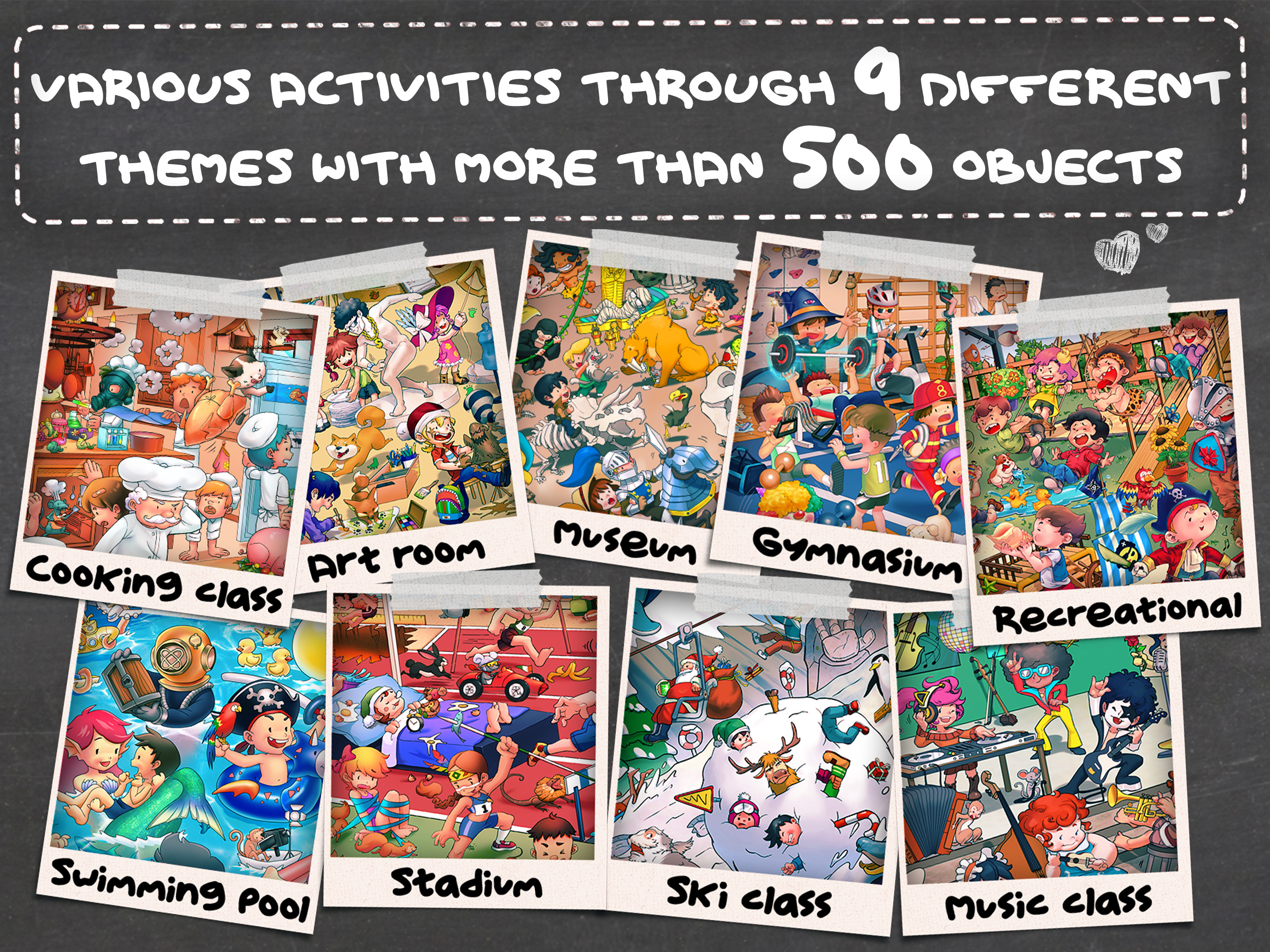 Look & Find: School Activities helps to build child's vocabulary with more than 500 objects in 9 different themes based on interesting activities at school -- the cooking class, the art room, the stadium, the swimming pool, the museum, the music class, and the playground. Zoom feature and randomly displayed objects make the game more interesting. The game is available in 11 languages – children can also learn foreign languages.