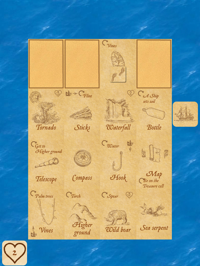 The island is gradually revealed as you explore it by placing the cards. You'll need to combine the different resources you discover to help you survive and hopefully attract the attention of the ships which periodically sail by. The map of the island, the location of items and when events occur will be different each time you play.