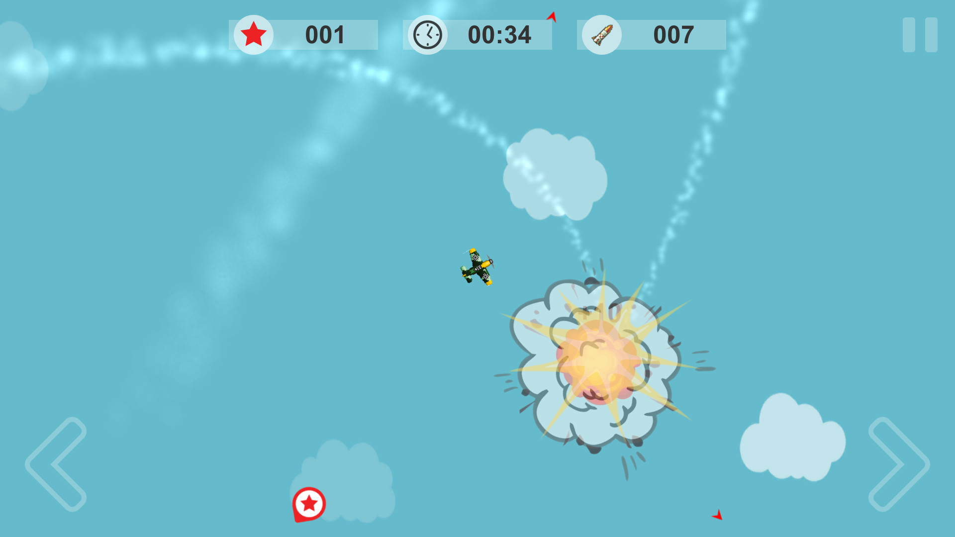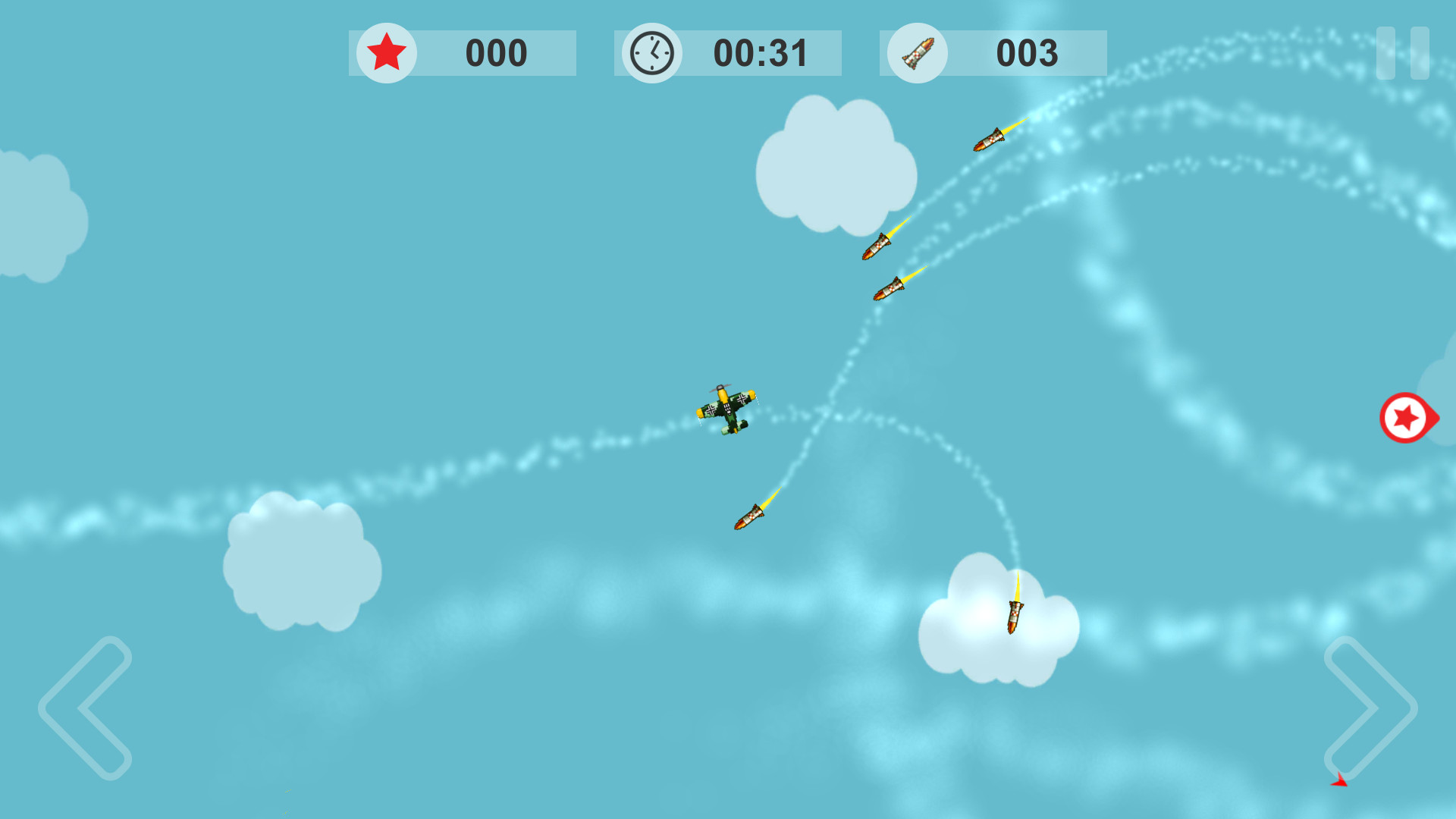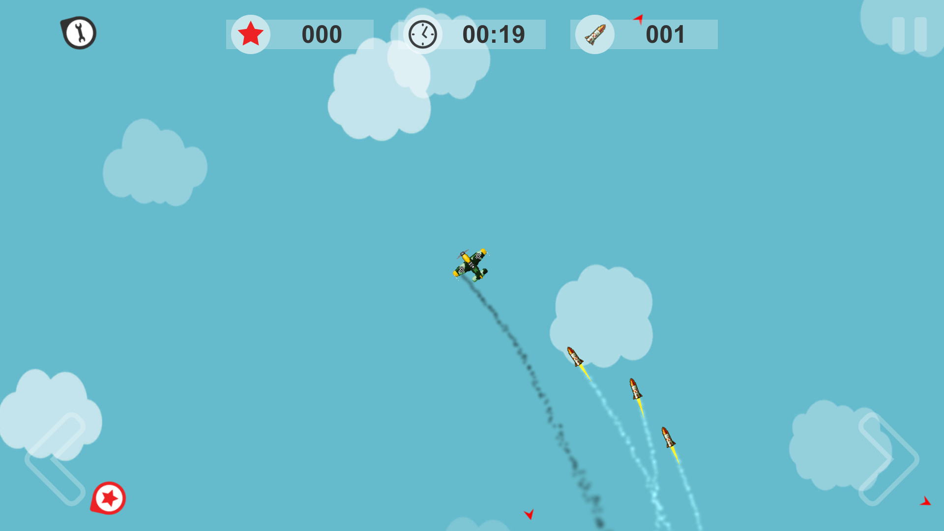Use the simple control to fly your plane and avoid the missiles. Make them collide with each other and collect stars to increase final score.