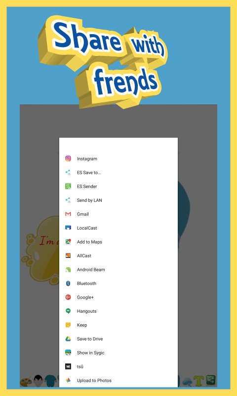 You can share your creation via email, Facebook, Twitter, Google+, WhatsApp Messenger, Facebook Messenger, VKontakte, Odnoklassniki, and through many other messengers and chat applications.