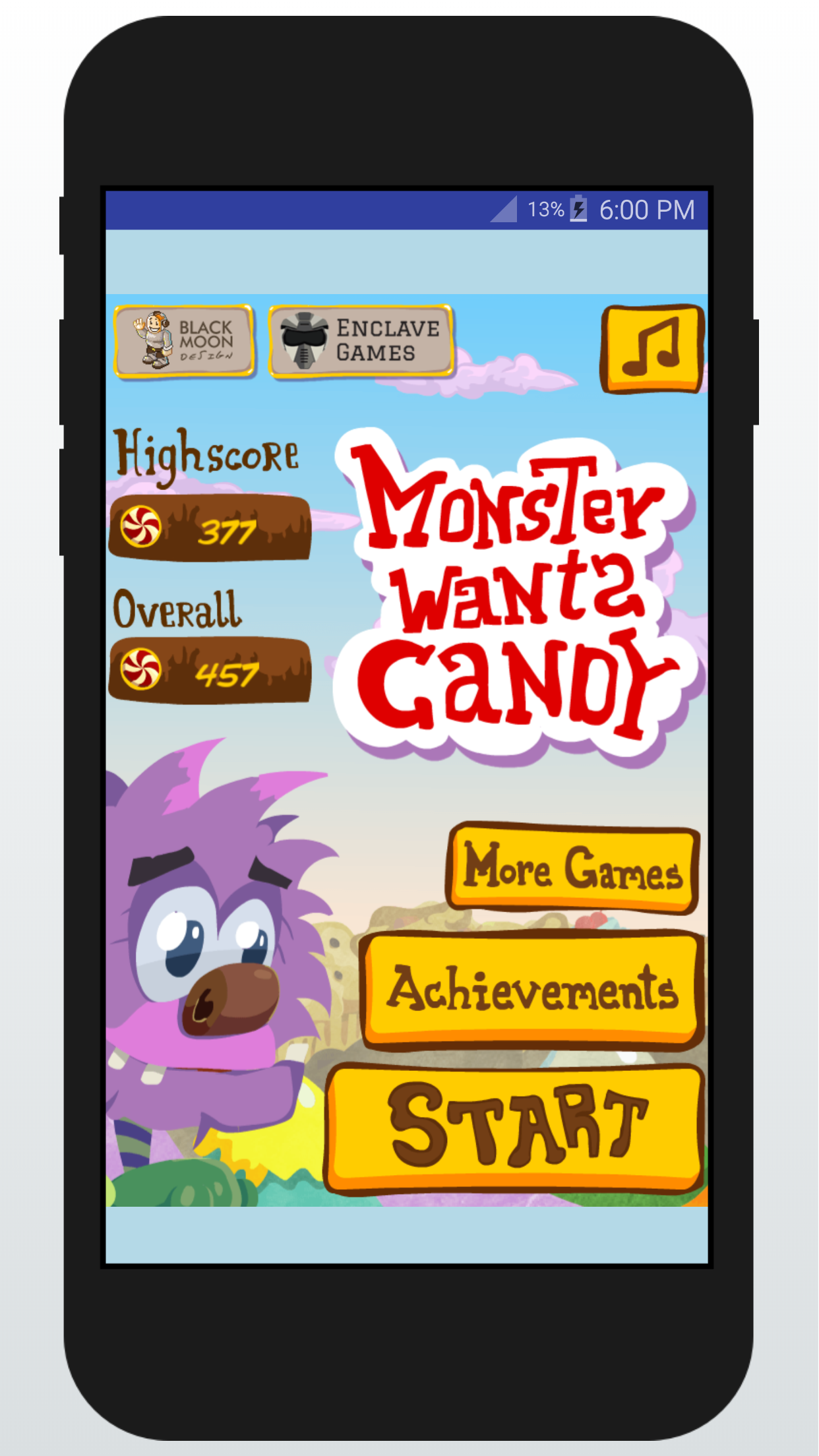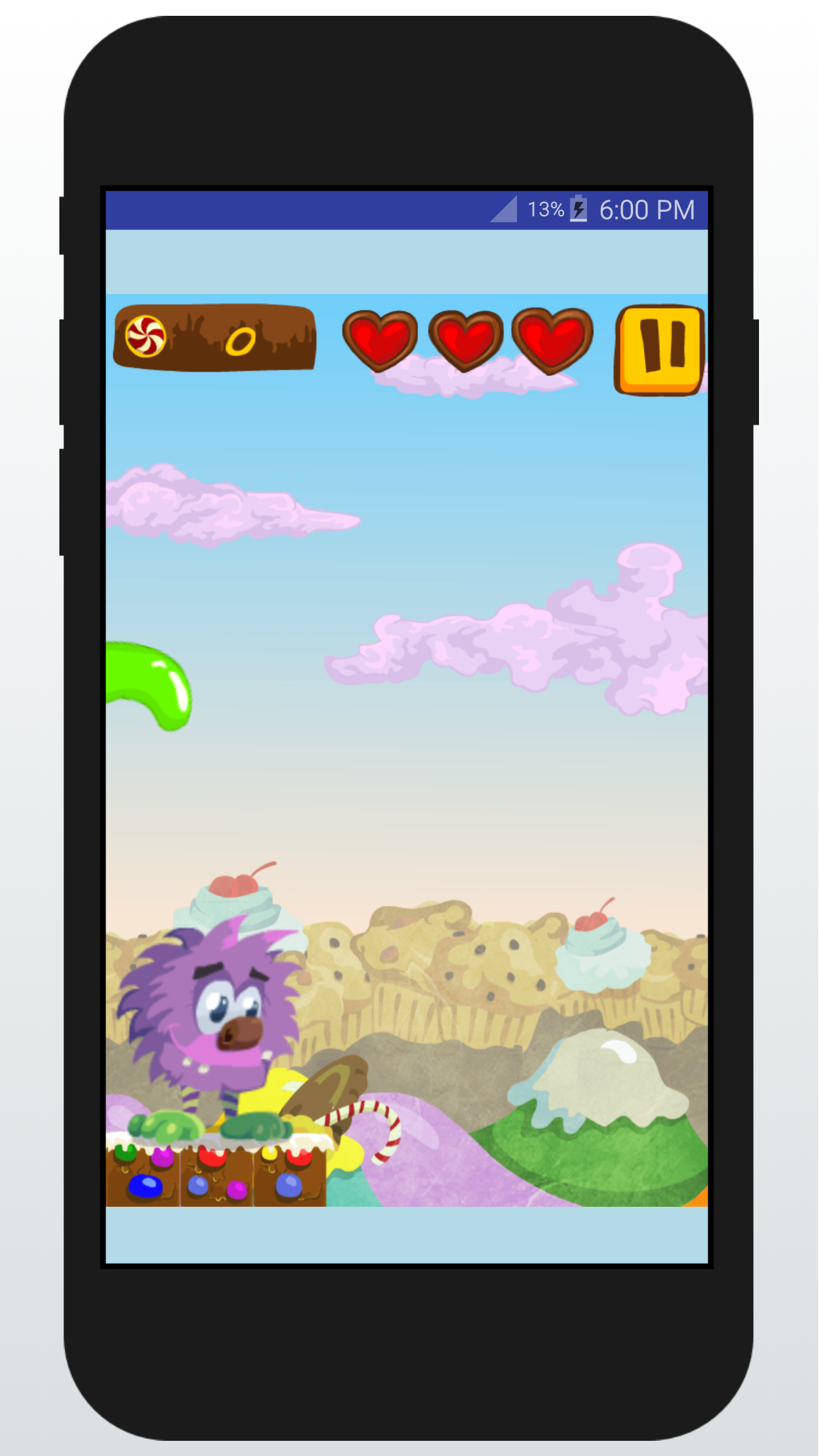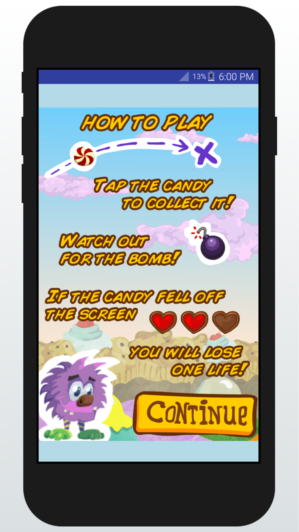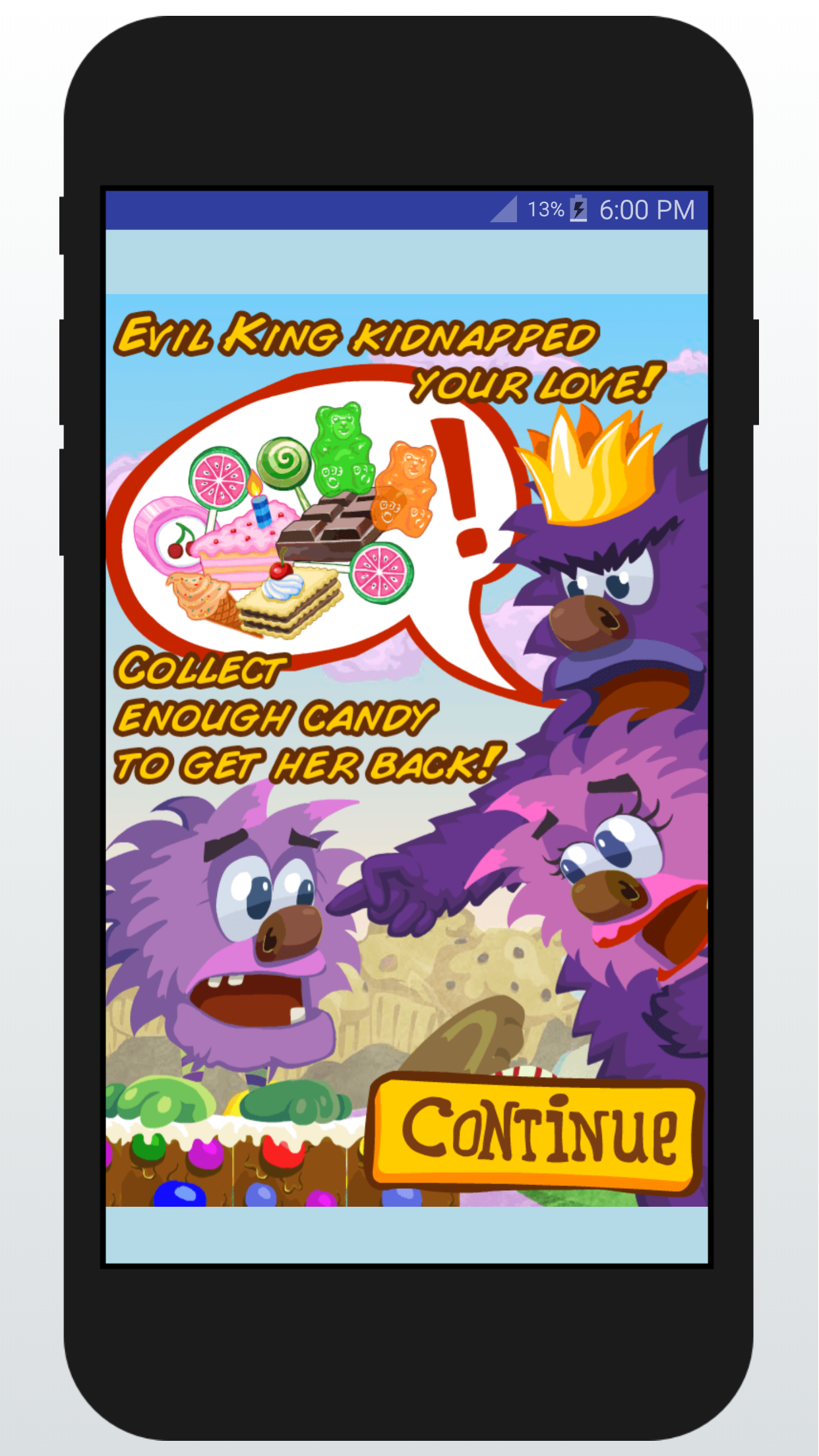Its a kids of simple games, the monster is hungry for candies, and the purpose from kids is to help the monster to eat so much candies to get back his girl kidnapped by the evil.