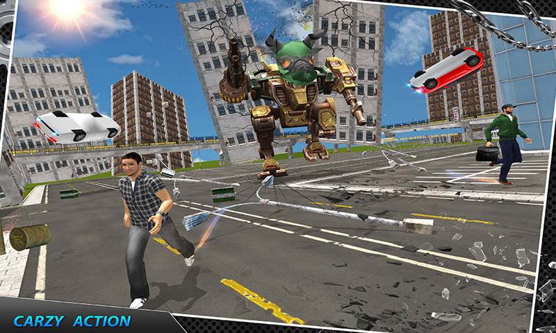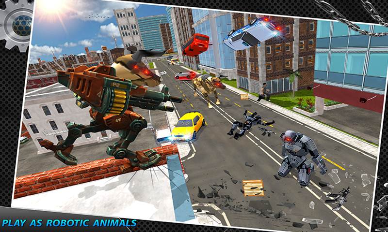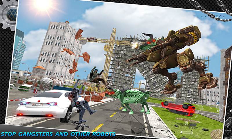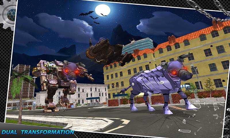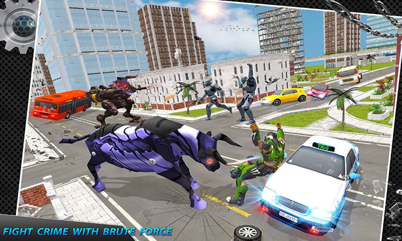 Now they can save them self by introducing Robotic Animals like bulls that will replace a human life on the field of Battle. To defeat the manmade robots you will need to change into a Mighty Wild Bull Beast that can smash a car just by walking on to it. You are also able to change yourself in to a Futuristic Humanoid Robot that can crush everything in its way and can move with the speed of sound. Enjoy a whole new level of Robo Wars in Multi Robot Bull Rampage Vs Futuristic Gangsters .