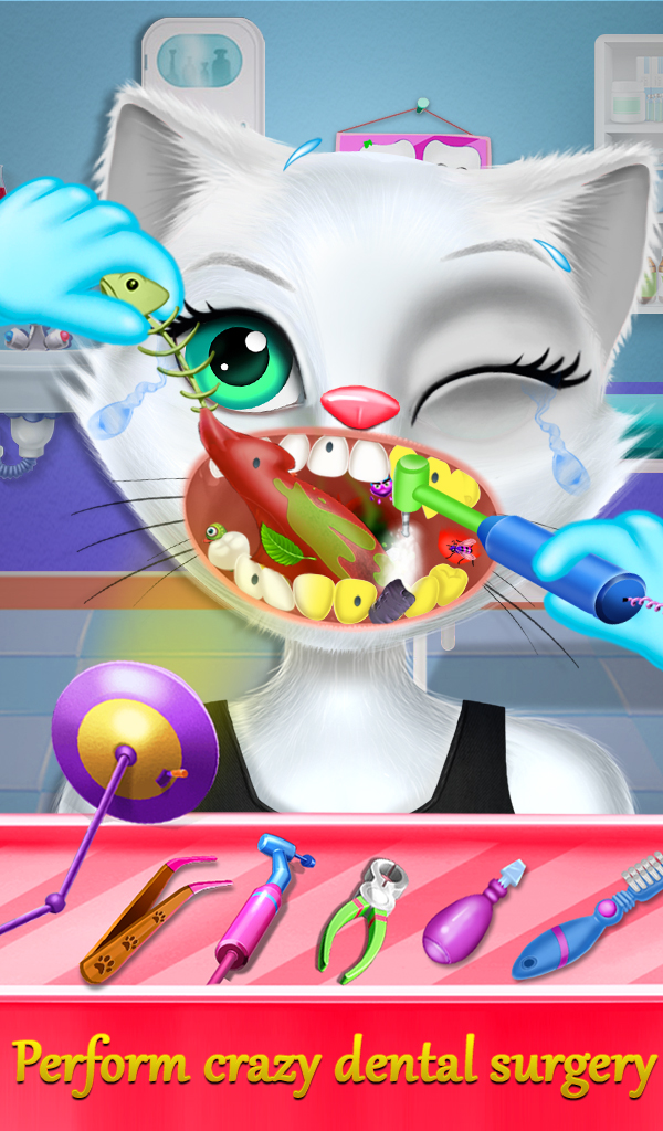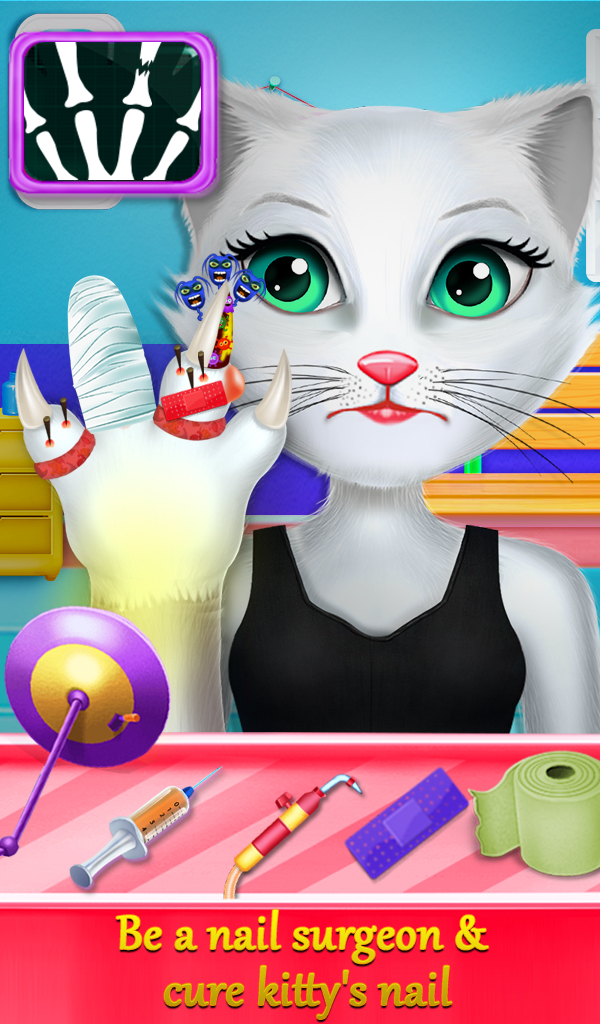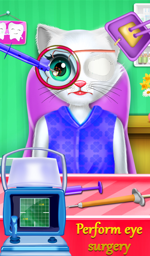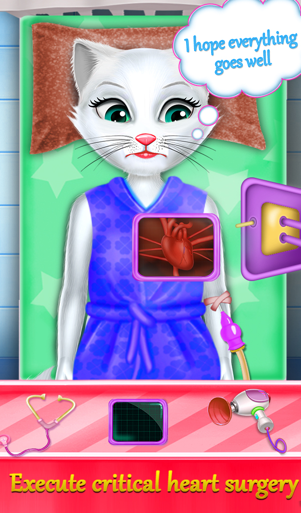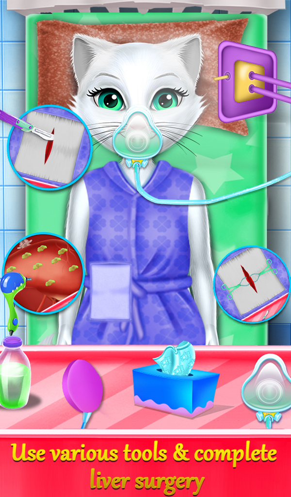 Oh. Kitty eats something bad during she was eating. She needs a stomach surgery to get it out from her stomach. Then kitty needs a regular ear checkup because she runs through the very dirty place so she is required ear surgery. My kitty always ends up with seek so there's a special hospital view where you need to give required treatment to this kitty like fever treatment, bone treatment, tail treatment and tooth treatment. There are also pregnancy surgeries of my kitty. You need to check up the kitty and give birth to a little kitty. This surgery simulator game also includes eye surgeries like eyeball and eyelash. There are complicated surgeries of a kitty like heart surgery game, lever surgery game, chest surgery game, nail surgery game and head surgery game. You need to cure her with some latest tools and performing complicated surgery.