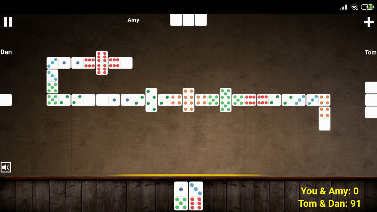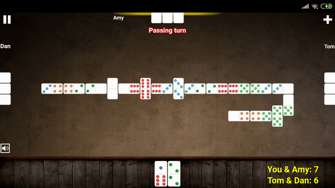 Players take turn anti-clockwise to play a matching tile on their turn. A player must play if there is a matching tile or else, can simply pass. Round ends when a player finishes all his/her tiles or, when the game gets blocked and no further move can be made. Winning team scores the total pip count of opponent team (ignoring their own pip count).
