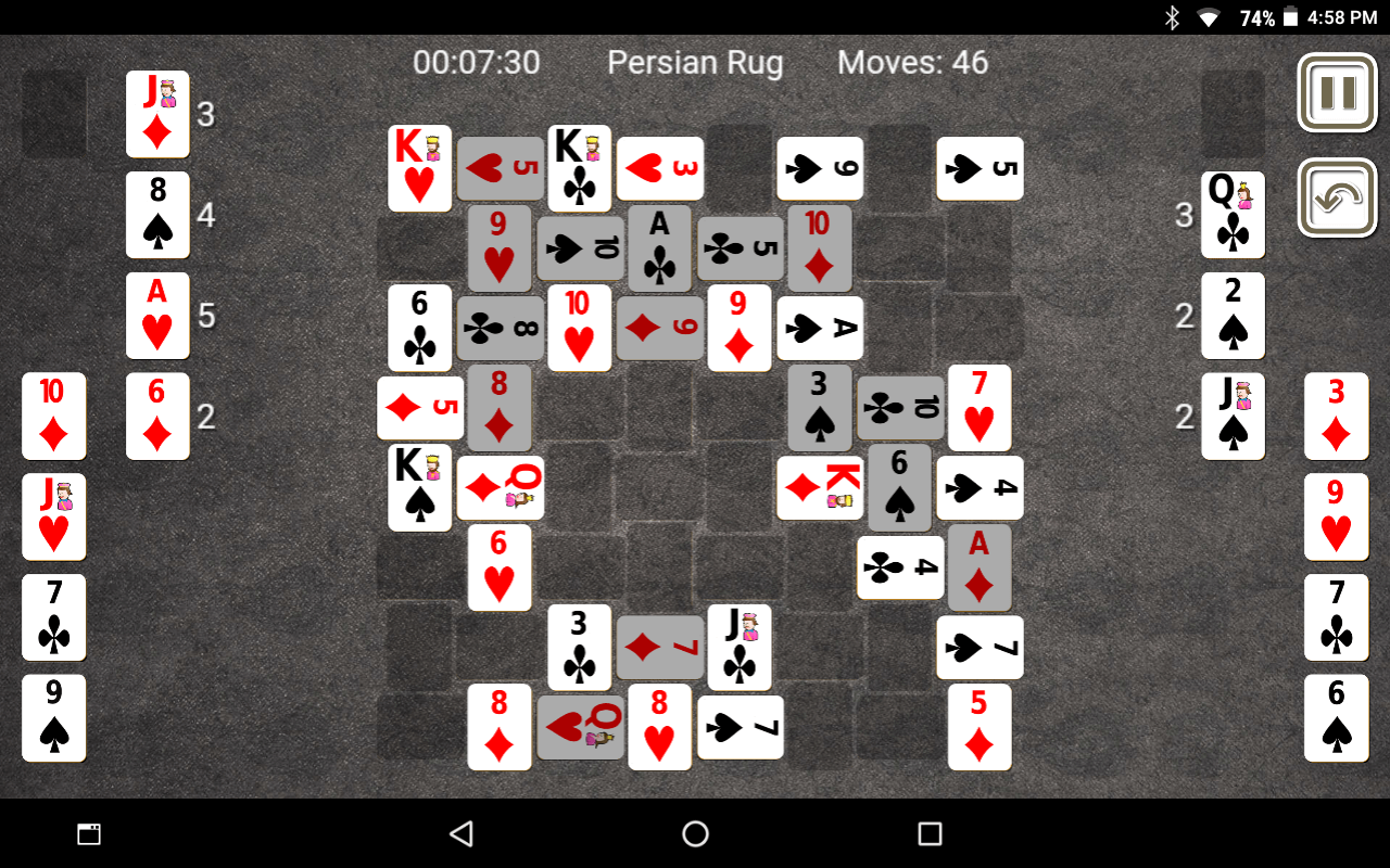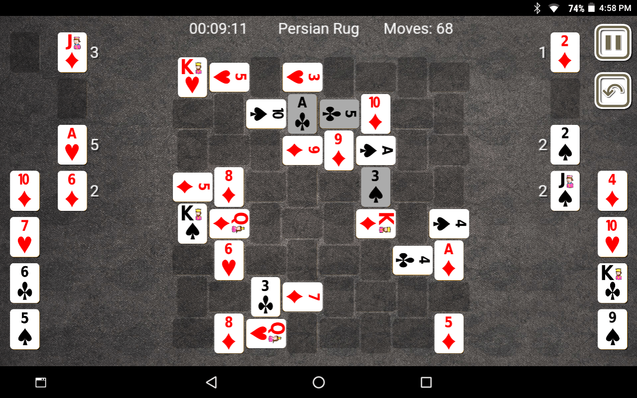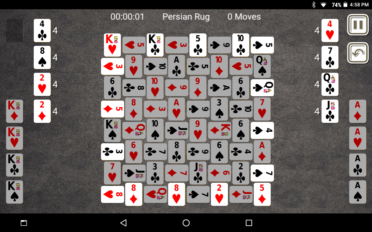 Persian Rug Solitaire is a variant of Crazy Quilt Solitaire played using 2 sets of standard 52-cards deck. The aim is to build four suits up from Ace to King and another four suits down from King to Ace. The name of this game is derived from the setup of tableau cards which resembles a carpet or a rug.