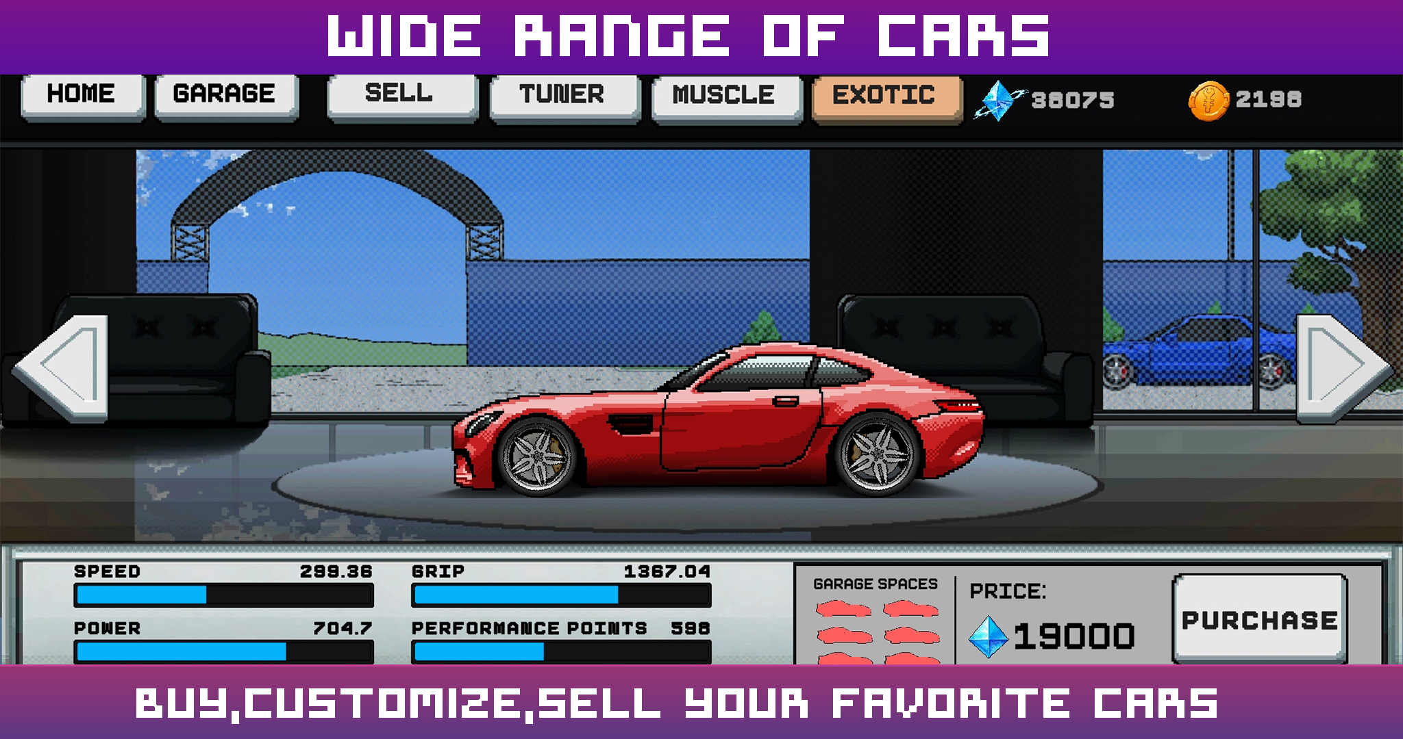 One of the most challenging pixel car racer games with countless features to build, tune, and race with your favorite cars!