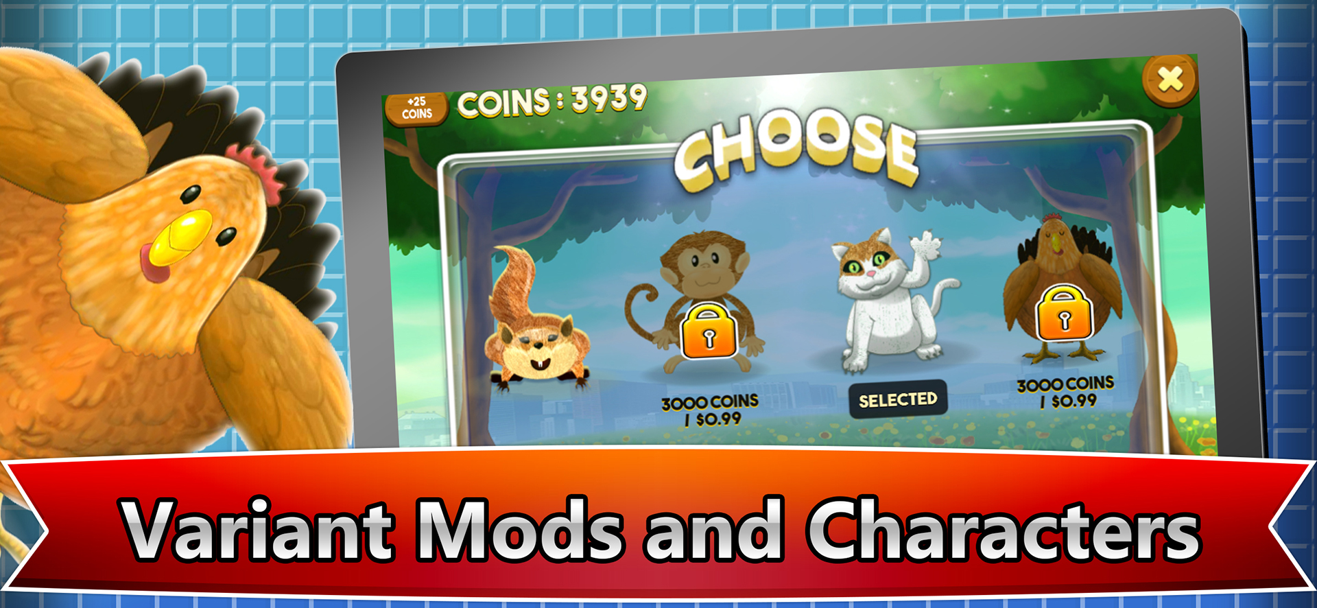 - Unlock cool new Characters (cat , squirrel , monkey , hen) !!