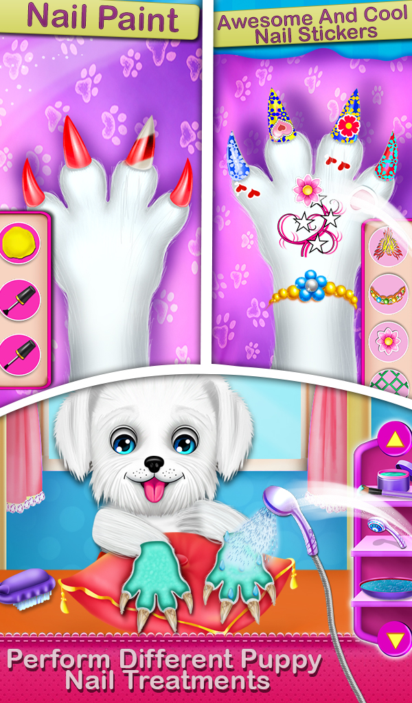 Do you want to enjoy with a puppy in your own spa salon? Then come and run your own dream salon for puppy. Here in this Puppy Dream Spa Salon game, you can find tons of interesting salon views like a beauty treatment, hair treatment, nail treatment, spa treatment, tattoo activities and much more. First of all, puppy wants attractive nail so you have to perform nail treatment like nail spa, nail paint, nail stickers and nail surgery. Next give him beautiful look by completing beauty treatment like face spa, face paint, make up and more. After that show your salon skills and prepare stylish hair stylish for him. Then perform your salon specialty treatment and put creative tattoos on his body. At the end bring various types of food items and feed to the puppy.
