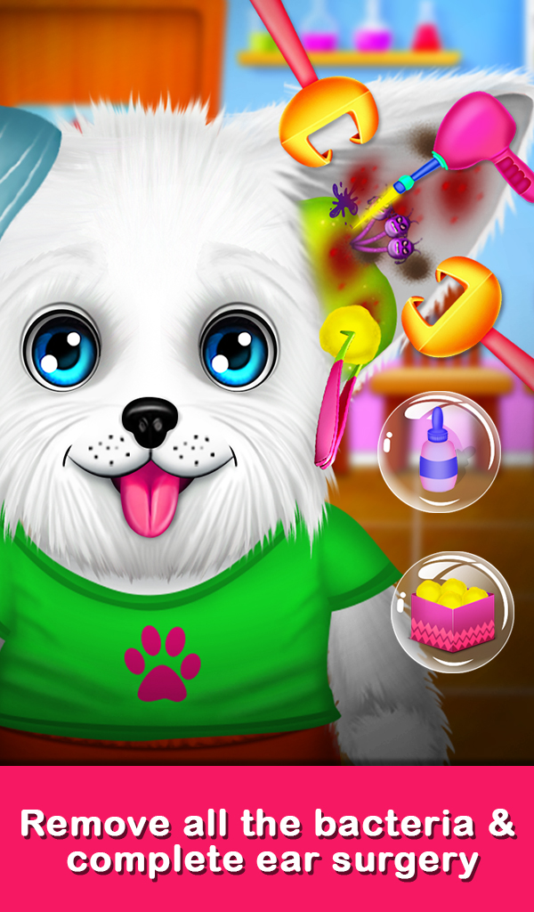The puppy has got an ear infection and needs an ear surgery immediately. Now, let's help him by doing a hand surgery and remove all thorny bushes from his body. After that, we need to perform teeth surgery because the puppy has a toothache and he can't eat anything. So you have to perform teeth polishing and decomposing the germs from his mouth. Puppy can't breathe properly because he has nose infection. Puppy needs a nose surgery with from the nose surgeon. After that, you have to perform stomach surgery for puppy's healthy life. In the eye surgery, you must examine puppy's eye through different tests like the color blind test, short vision test and many more. At last, you have to perform brain surgery to cure his accident injury. There are so many different surgeries which will entertain you for hours.