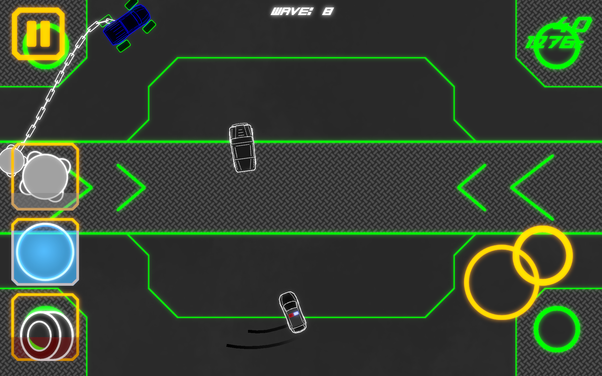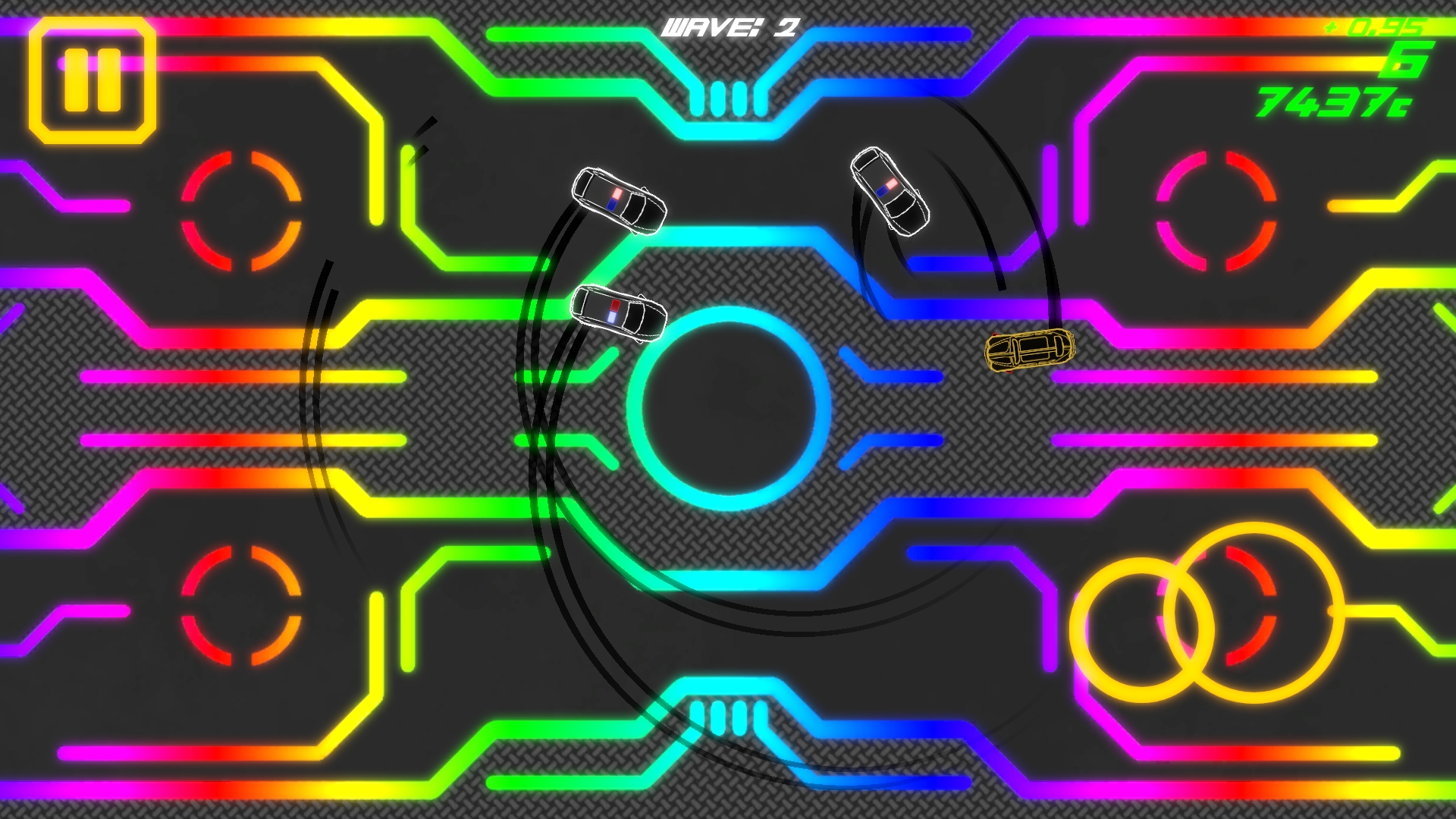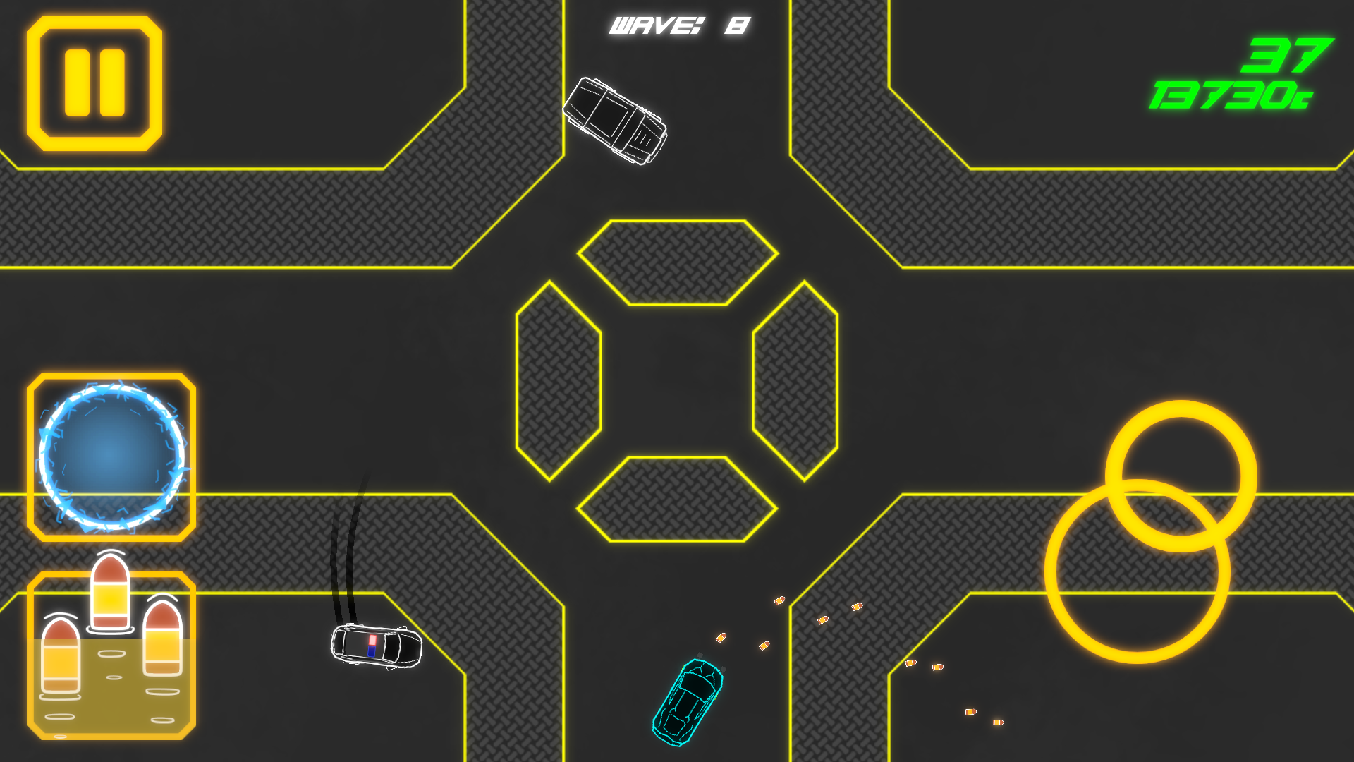 In "Racers" you flee from the police. Sounds simple, but there are a few problems: The space is very small, the police is smart and you... don't have any brakes. There are various different items available, such as a shockwave or a laser. Let your opponents explode by hitting them with your weapons or letting them ram each other until you finally are ( or were...) the next explosion.