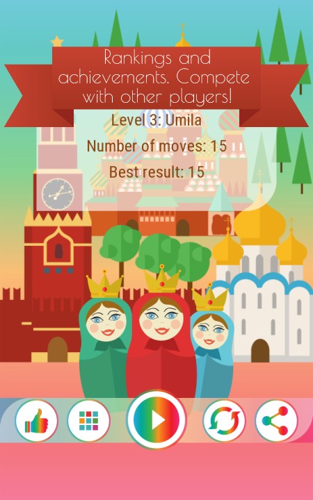The goal - to collect them all in the least number of moves. Big nesting dolls absorb the small ones if they are the same color.