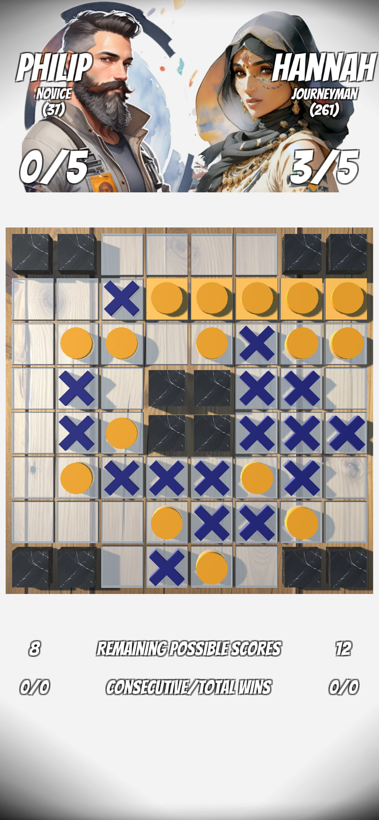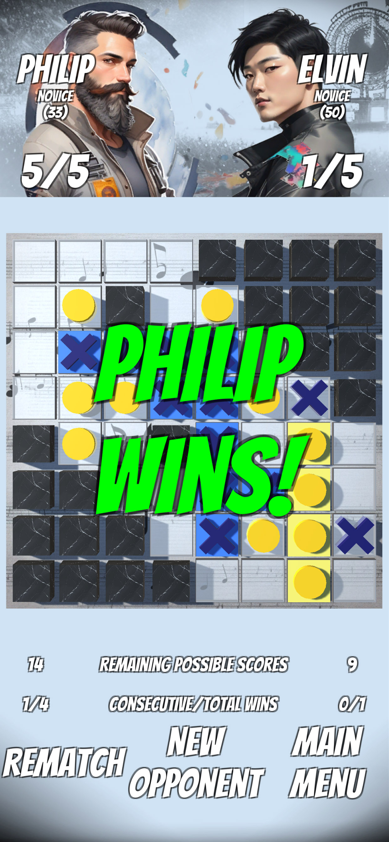 Play against either AI opponents of varying difficulties or a friend. Players have the option to participate in single games or join a league where each player competes against one another. The app features a ranking system that starts at Novice and progresses as players win.