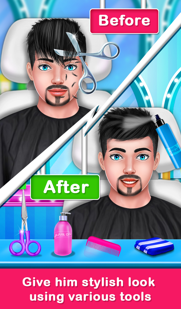 This beard salon game provides multiple salon activities like back massage, beard shave, facial, hair cutting, piercing, tattoo and many more. A prince Jack wants to impress his girlfriend in the date. So he needs a makeover and salon treatments before the date. You need help the Jack to complete all the salon treatments. Firstly, Jack is tired so he needs a back massage for body relaxing and refreshing. Now Jack desires a handsome look so give him a stylish beard, facial treatment and a cool haircut. After that Jack is passionate about tattoos and piercing treatment. So do trendy piercing and make awesome tattoos on his different body parts like ear, tummy and eyebrow. Now the day of the date has arrived. This love game is not done without jack's success love story. It's a special day for Jack. Capture some lovely photos of this couple and perform a candlelight dinner in the hotel and have an interesting kissing prank. This prince salon game gives you self-grooming makeover.