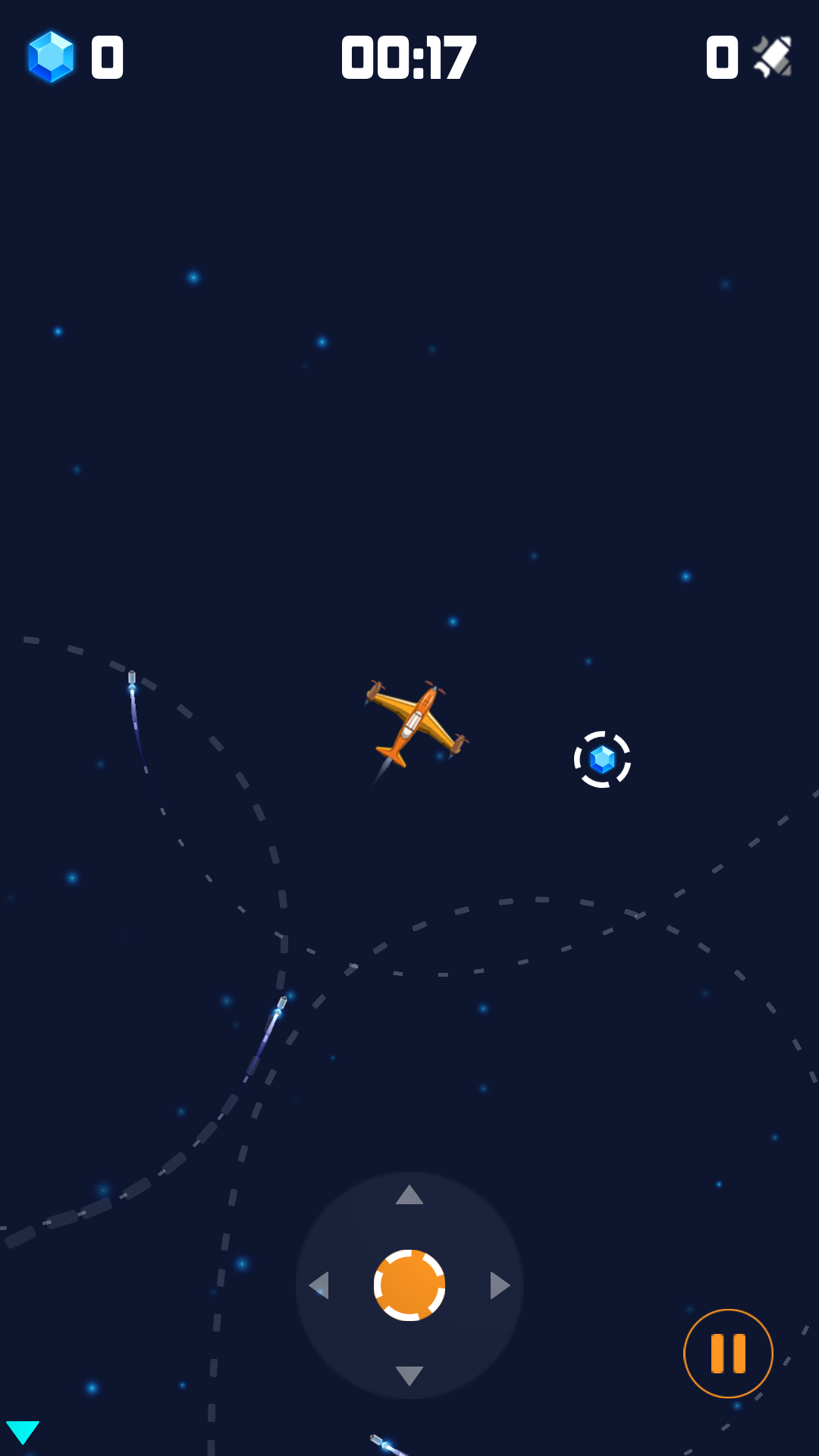 Alarm rings and those crazy missiles start the chase. Steer your airplane cleverly to avoid missiles and collect Crystal to purchase faster and more agile airplanes.